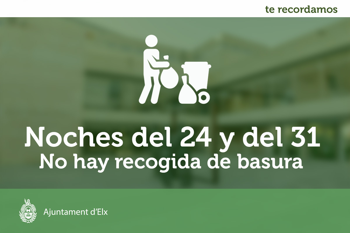 El Ayuntamiento recuerda que los días 24 y 31 de diciembre no habrá recogida de basura por lo que se pide a la ciudadanía que se evite depositar los residuos orgánicos en los contenedores durante esas dos jornadas