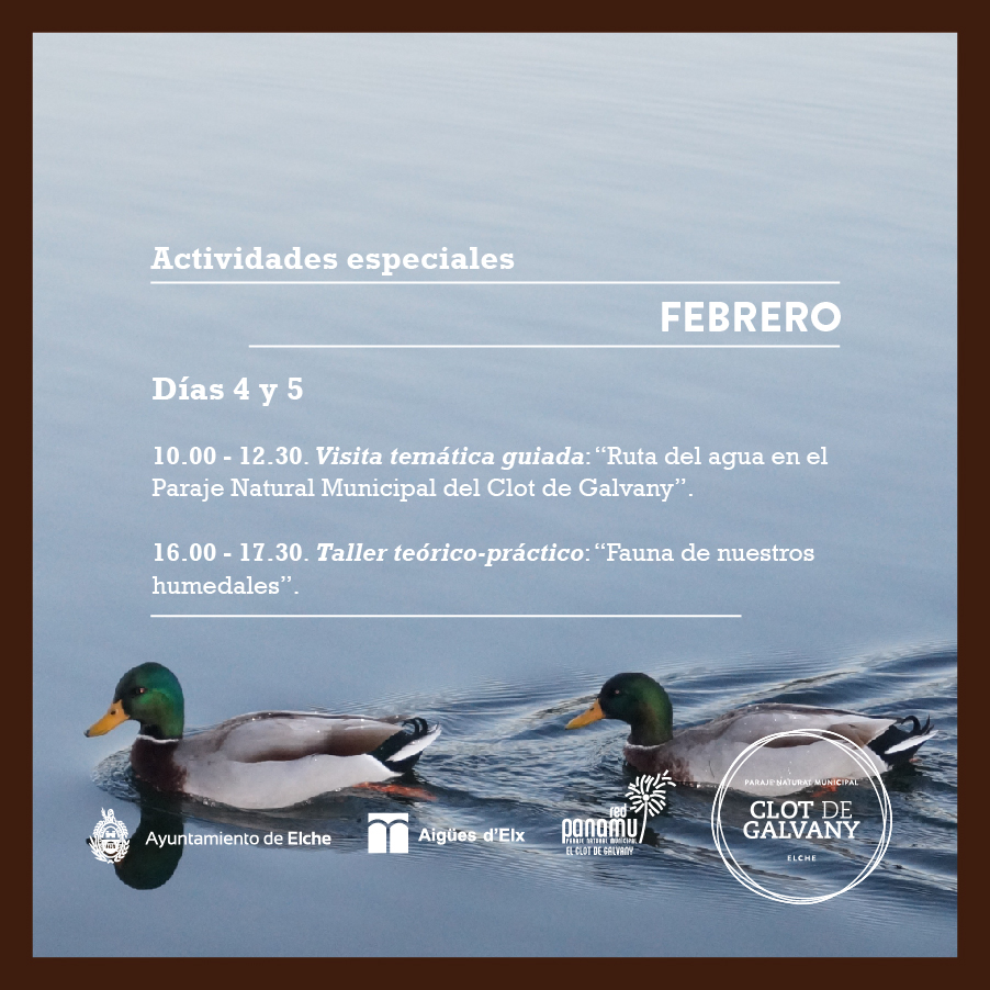 Este fin de semana el paraje celebra el Día de los Humedales a través de actividades como una visita temática sobre la ‘Ruta del Agua en el Paraje Natural Municipal del Clot de Galvany’ por la mañana, o el taller teórico-práctico ‘Fauna de nuestros humedales’, que se desarrollará por las tardes.
