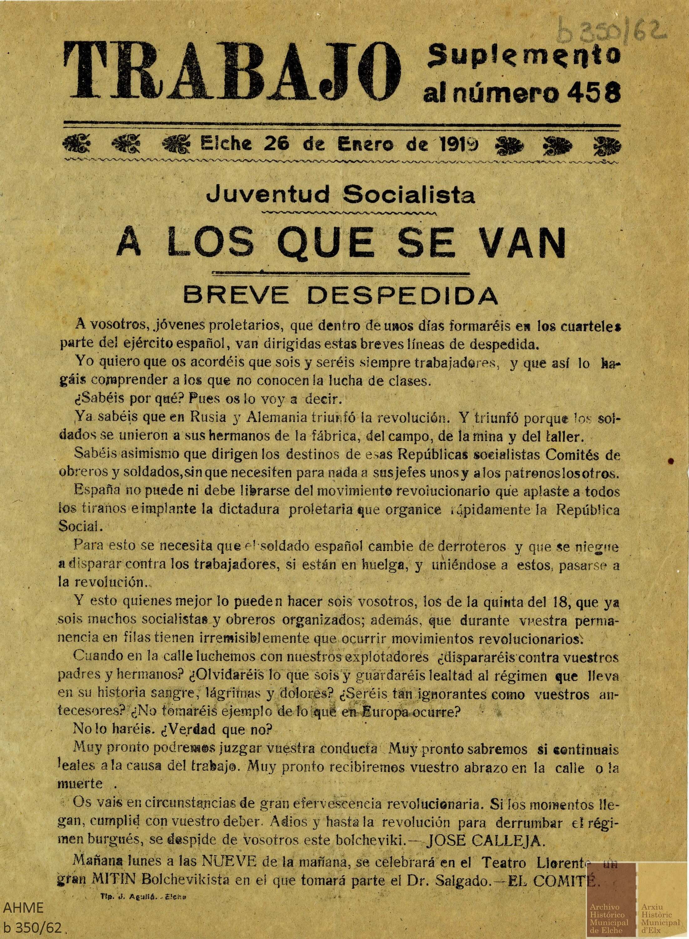 Como documento del mes hemos elegido un suplemento de la publicación Trabajo, fechado el 26 de enero de 1919, en Elche, titulado «A los que se van. Breve despedida». Puesto que no se conservan documentos directos que hablen sobre el inicio de la revolución, este impreso, de fecha posterior, recoge el espíritu del movimiento.