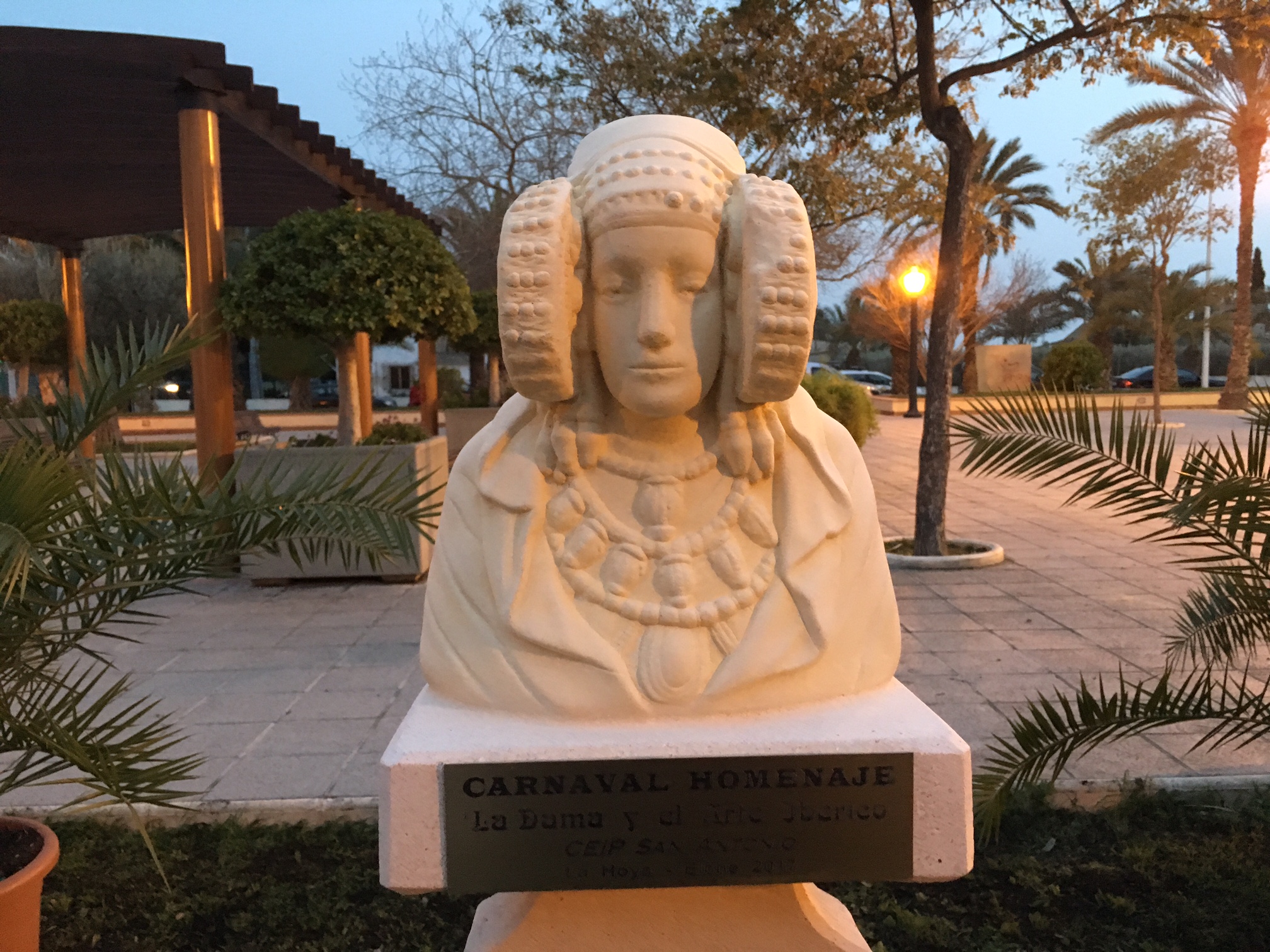 El busto ha sido donado por una empresa que prefiere permanecer en el anonimato y lleva la leyenda “Carnaval, homenaje a la Dama y el arte ibérico”. El alcalde destacó durante su alocución el significado del busto ibérico para todos los vecinos de Elche y explicó los pasos que se están dando para reclamar su vuelta a la ciudad. También destacó el hecho de que los vecinos de la pedanía “suméis vuestra voz a la voz de la ciudad reclamando que la Dama vuelva cuanto antes”. Por su parte, Miguel López explicó el proceso que ha permitido llevar a cabo la idea de instalar el busto “en un sitio céntrico y precioso” y agradeció “en el nombre del claustro, del consejo escolar y de las asociaciones” la presencia del regidor.