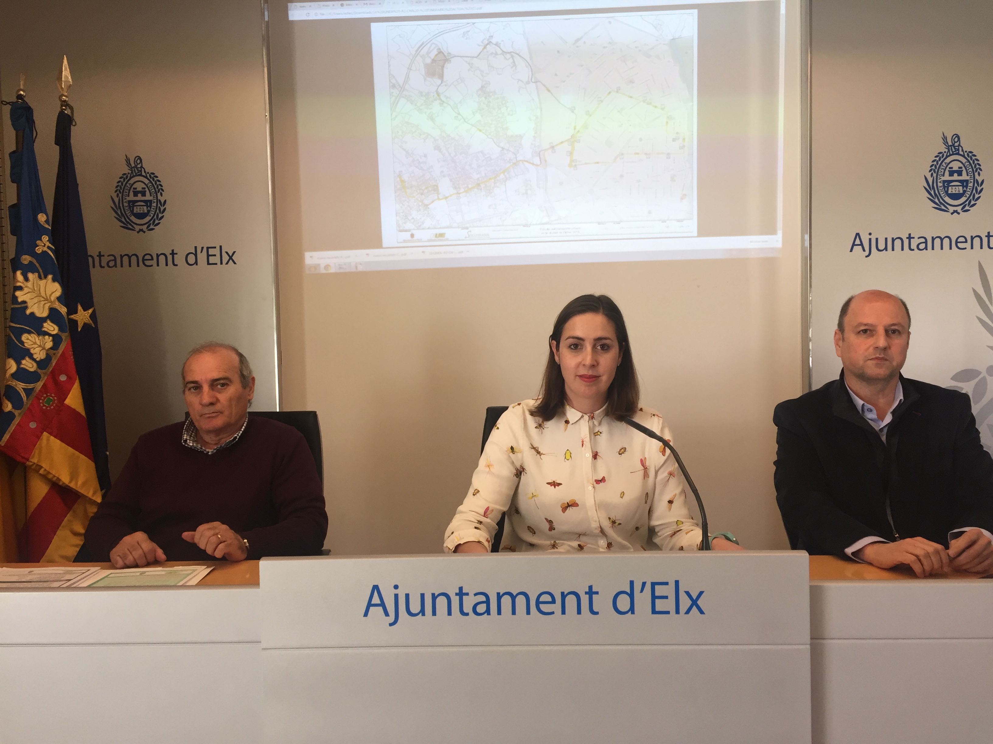La edil de Movilidad Urbana, Esther Díez, acompañada por el gerente de Autobuses Urbanos de Elche, Ángel Luis Andreu, y el pedáneo de Peña Las Águilas, Alejandro Salgado, ha anunciado cambios en la línea R2 con el fin de dar respuesta a viejas reivindicaciones de los vecinos.