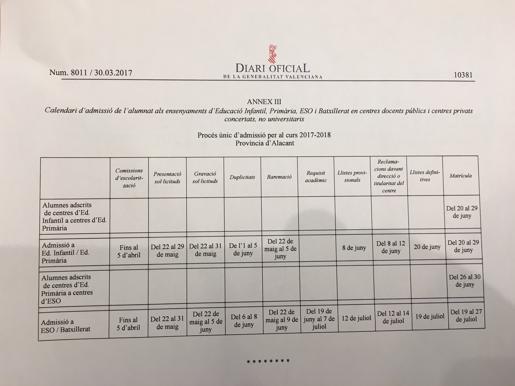 La Conselleria de Educación ha publicado hoy el calendario de admisión del alumnado para Infantil, Primaria, Educación Secundaria Obligatoria (ESO) y Bachillerato, según ha informado esta mañana la concejal de Educación, Patricia Macíá”, quien señala que “se establece el calendario de presentación de solicitudes por parte de los padres que tienen hijos nacidos en 2014, que es el censo con el que trabajamos para la admisión de alumnado de este año”.