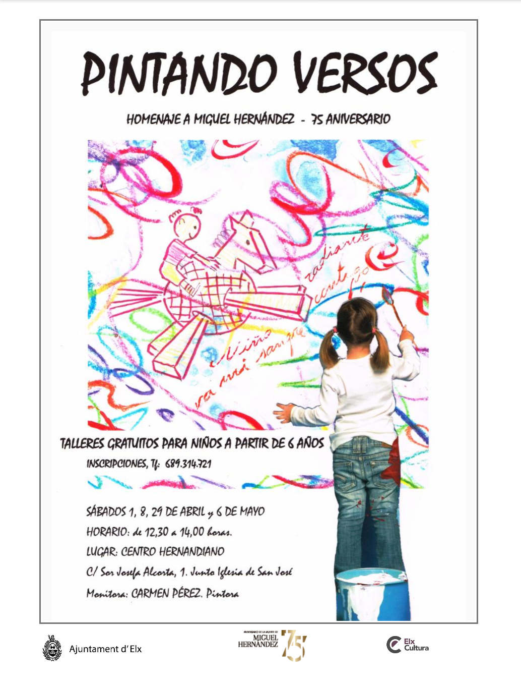 En torno a cuarenta niños ilicitanos entre los 6 y los 11 años de edad participarán este próximo sábado por la mañana en el taller “Pintando versos”, impartido por la artista Carmen Pérez en el marco de las actividades conmemorativas organizadas por el Ayuntamiento de Elche con motivo del 75 aniversario del poeta. El taller se impartirá en el Centro de Estudios Miguel Hernández (c/ Sor Josefa Alcorta,1 junto a la Orden Tercera de San José) y su objetivo es acercar a los niños los versos del poeta de una manera creativa y divertida con juegos, dibujos y lecturas.