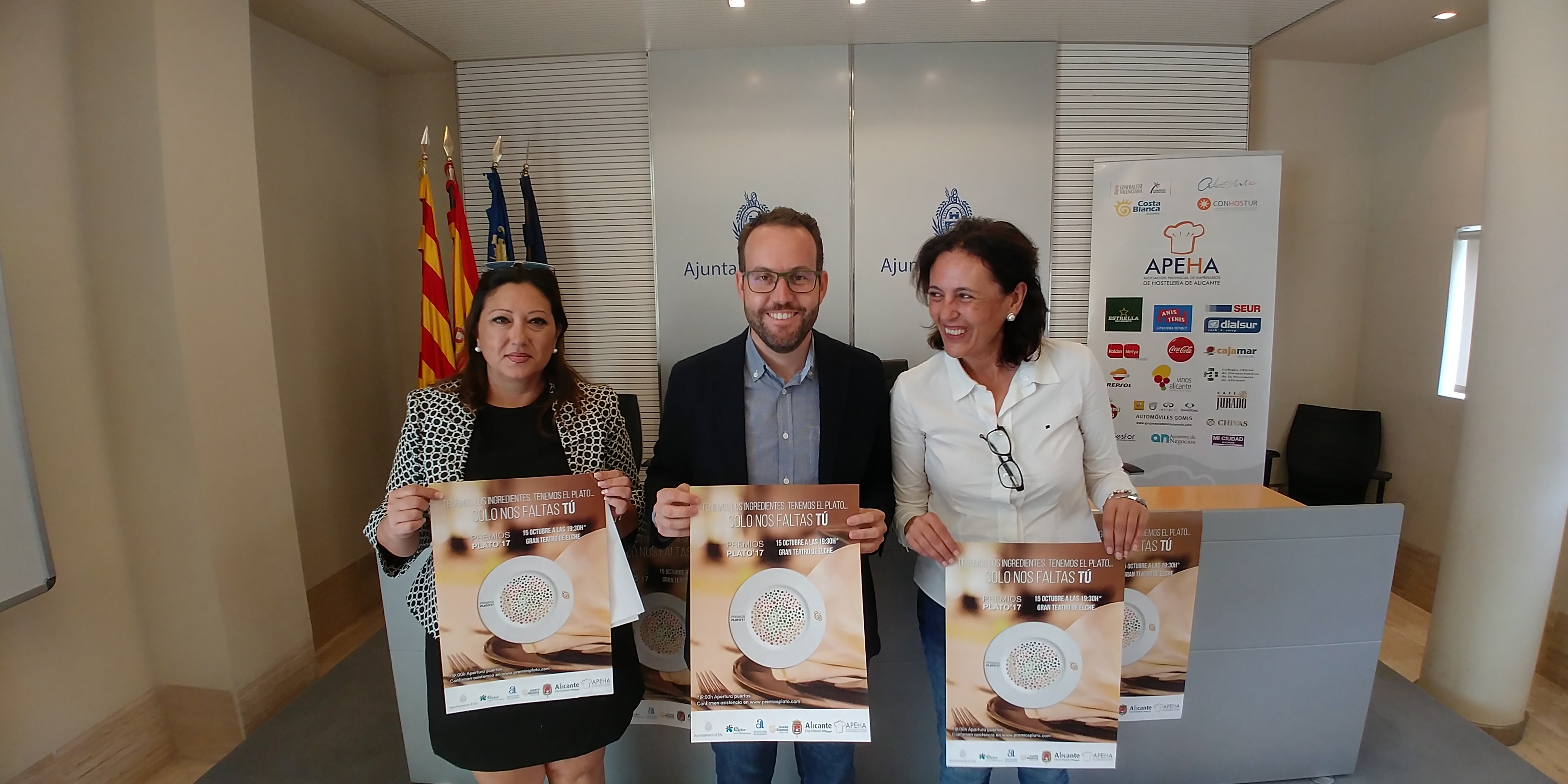 Héctor Díez, edil de Promoción Económica, María del Mar Valera, presidenta de la Asociación Provincial de Empresarios de Hostelería de Alicante, y Gloria Vara, edil de Comercio del Ayuntamiento de Alicante, han presentado la IV edición de los Premios Plato, que tendrá lugar el próximo 15 de octubre en el Gran Teatro de Elche.