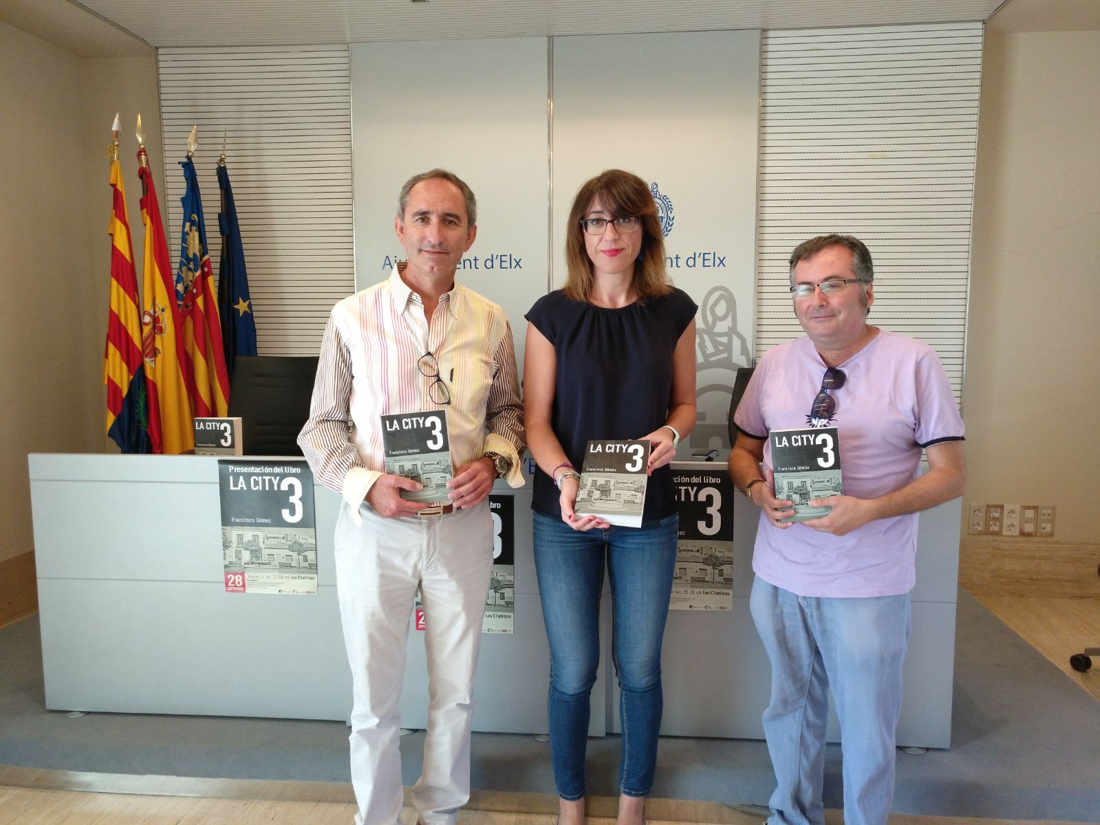 La edil de Cultura, Patricia Macià, el escritor, Francisco Gómez, y el director general del Grupo Antón, José Antón, han presentado esta mañana el libro “La City 3”, una obra compuesta de 112 artículos independientes que muestran la historia y la evolución de Elche desde principios del siglo XX hasta finales del siglo XXI.