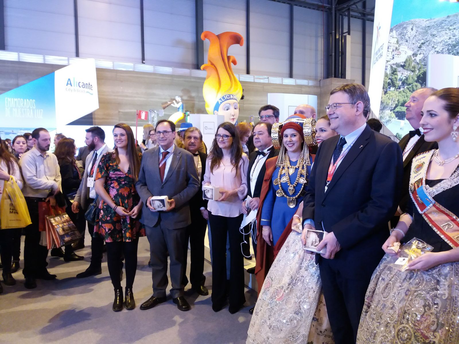 La concejala de Turismo, Mireia Mollà, acompaña al presidente del Consell, Ximo Puig y a la vicepresidenta, Mónica Oltra, junto al equipo de Visitelche en el Día de la Comunitat Valenciana en FITUR 2018