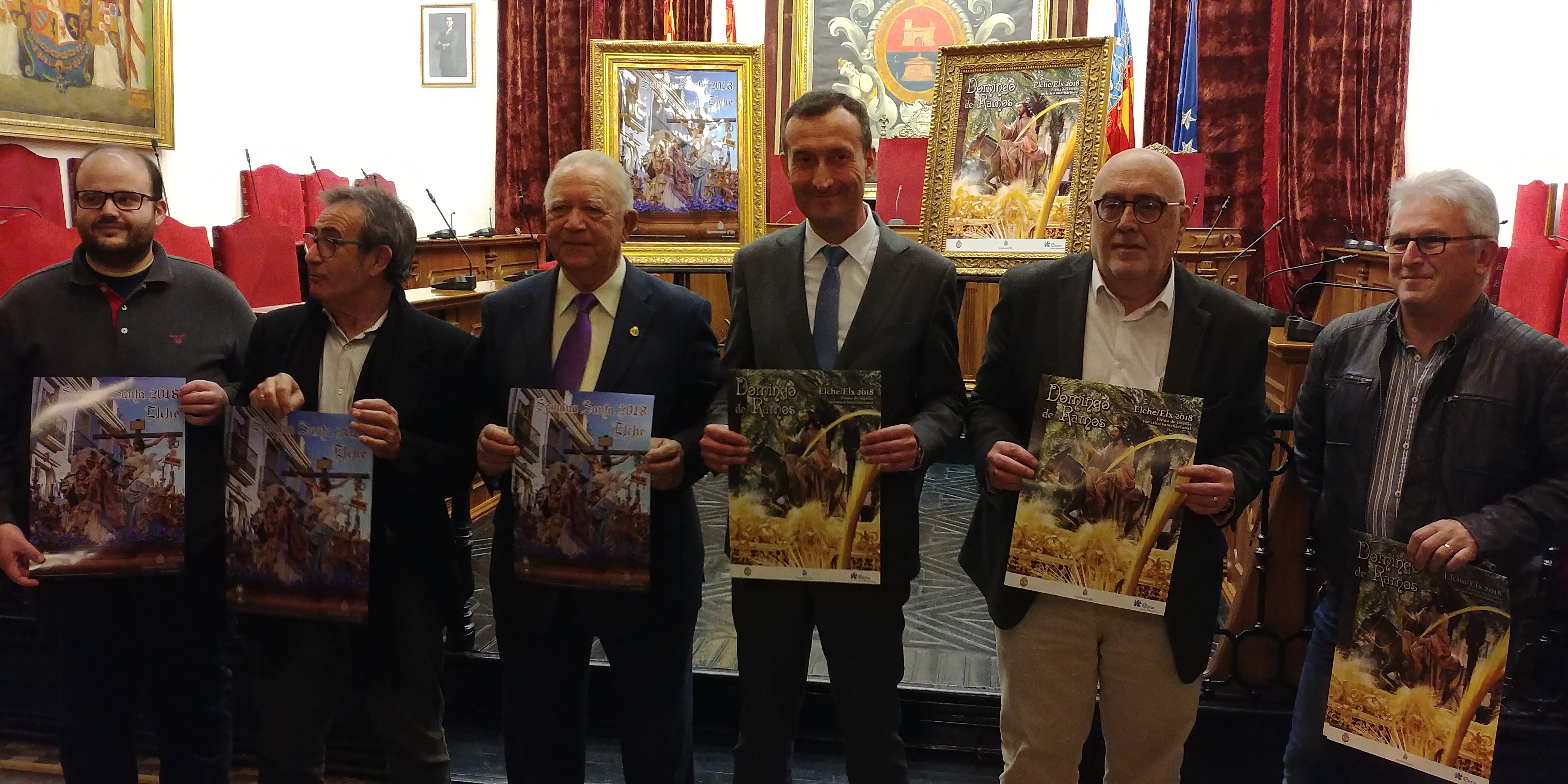 Ha tenido lugar en el salón de Plenos del Ayuntamiento la presentación de los carteles anunciadores de la Semana Santa y Domingo de Ramos 2018. Un acto en el que el alcalde, Carlos González, ha felicitado a los autores de los carteles por su gran trabajo y ha recordado que “desde el Ayuntamiento estamos trabajando en estrecha colaboración con la Junta Mayor para conseguir la declaración de Fiesta de Interés Turístico Autonómico para la Procesión de las Aleluyas, porque estamos convencidos de que la singularidad del Domingo de Pascua en Elche es digna del mayor de los reconocimientos”.