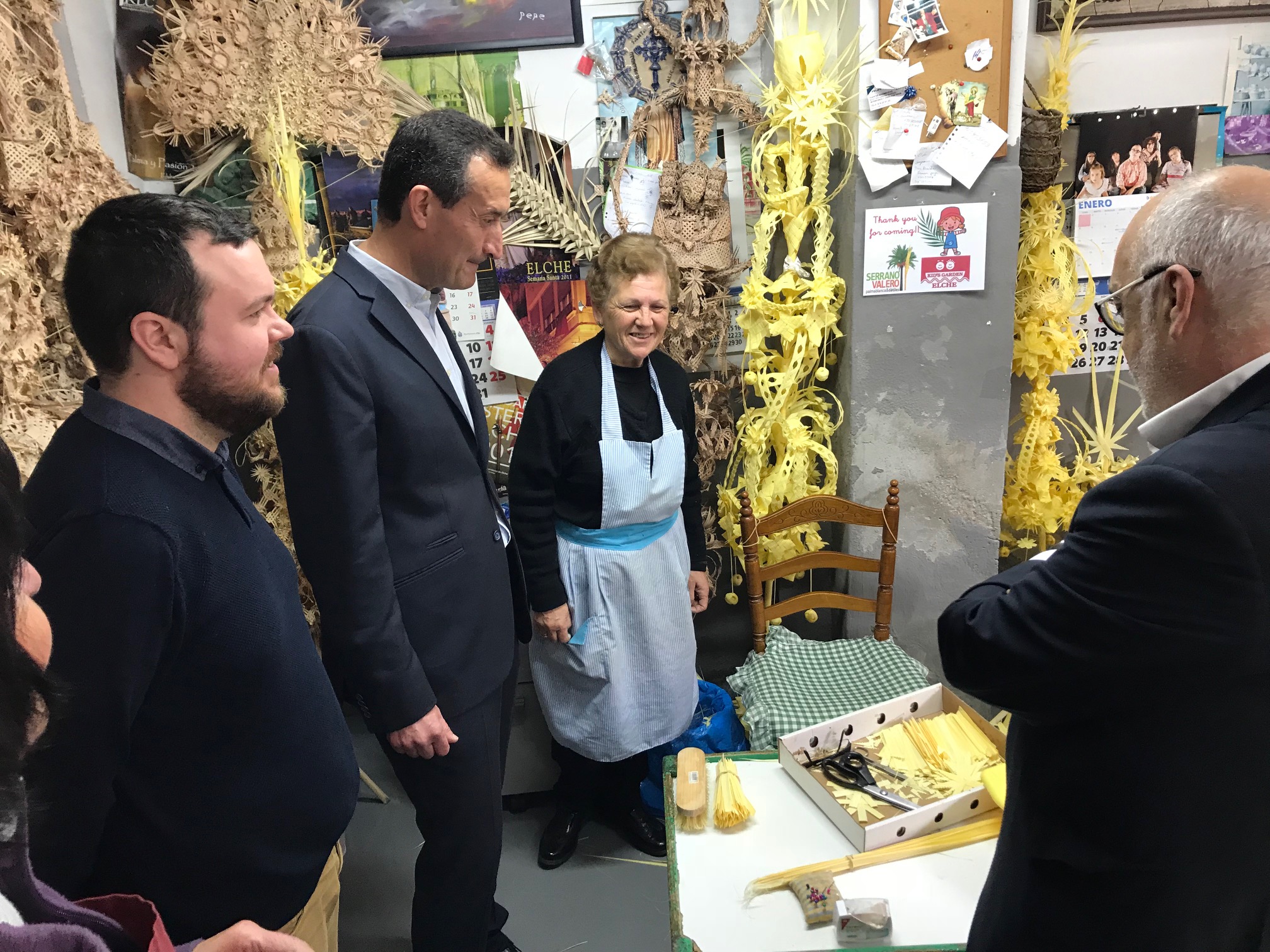 El alcalde, Carlos González, y el edil de Palmeral, Antonio García, han visitado el taller de palma blanca de la familia Serrano, donde estas semanas se está trabajando sin descanso para la elaboración de las palmas blancas que los ilicitanos lucirán en el Domingo de Ramos.