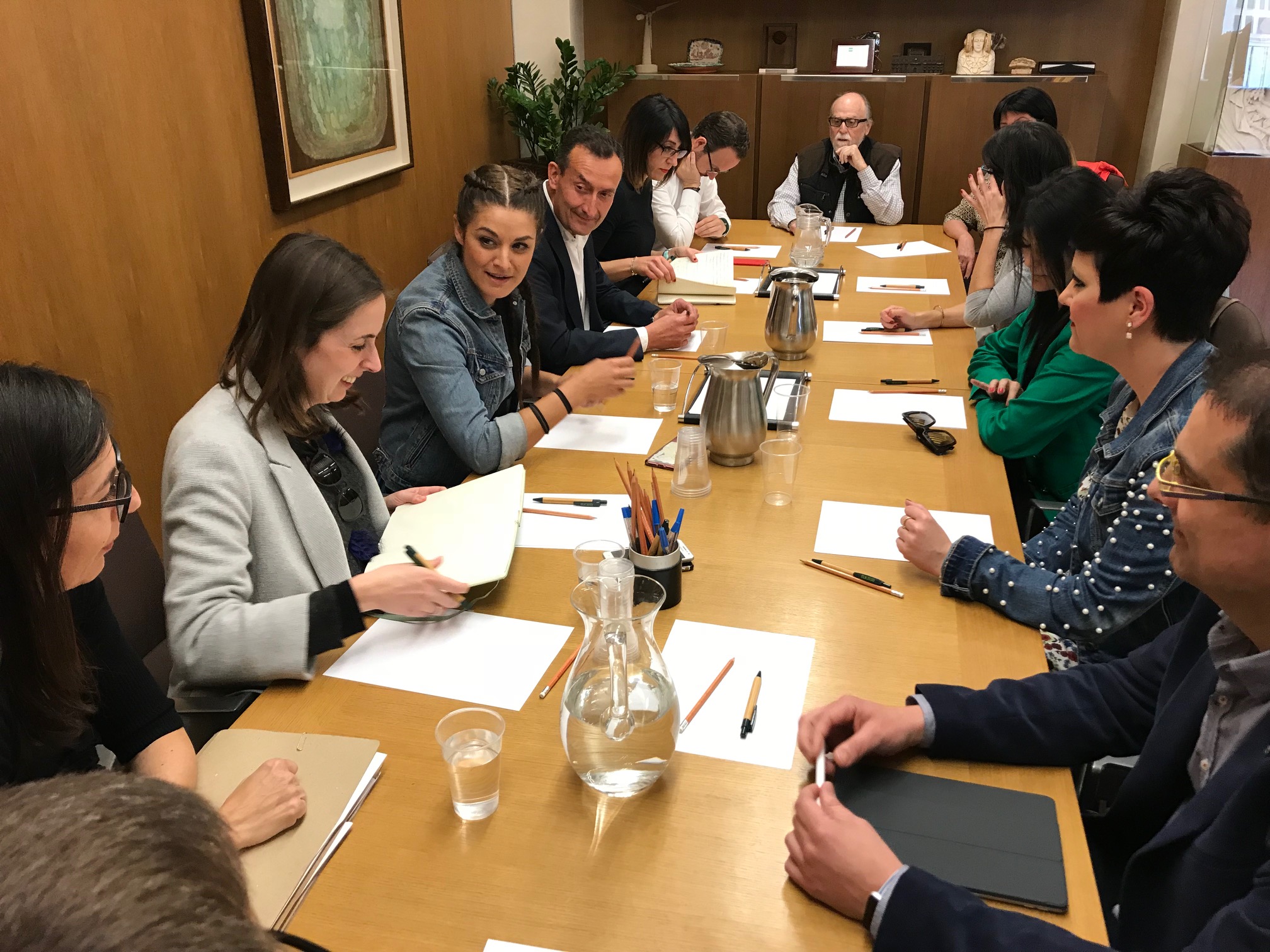 El alcalde de Elche, Carlos González, junto con los miembros del equipo de gobierno Mireia Mollà, Patrícia Macià, Esther Díez y Héctor Díez mantuvieron una reunión con representantes de las asociaciones de vecinos de la calle Ángel y las asociaciones de comerciantes del centro para informar del aplazamiento de la licitación del proyecto de peatonalización de la Corredora con el fin de buscar un amplio consenso entre vecinos y comerciantes.