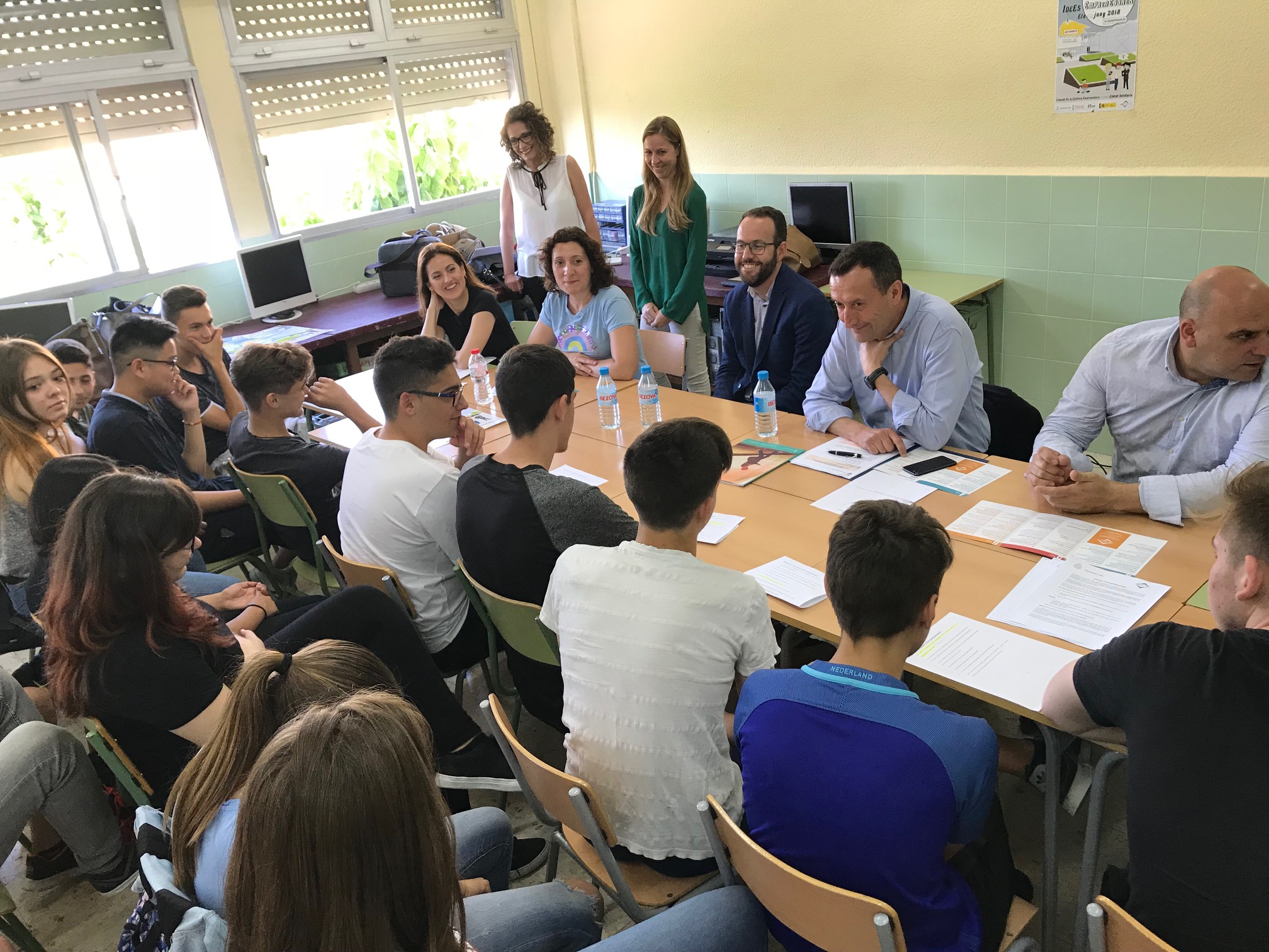 El alcalde, Carlos González, y el concejal de Promoción Económica, Héctor Díez, los secretarios de CC OO y UGT, Carmen Palomar e Ismael Senent, junto con técnicos municipales, han mantenido un encuentro con el alumnado y profesorado del Instituto de Educación Secundaria Pere Ibarra donde han conversado sobre el espíritu emprendedor y la responsabilidad que supone poner en marcha una idea empresarial.