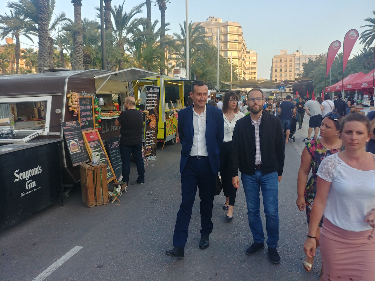 El alcalde de Elche, Carlos González, junto con el edil de Promoción Económica, Héctor Díez, y la edil de Cultura, Patrícia Macià, acudieron a la inauguración del Street Food Market, que el pasado fin de semana reunió en el Paseo de la Estación a 22 camiones, furgonetas, caravanas, tenderetes y carritos con estética vintage que ofrecieron una amplia oferta gastronómica acompañada de actividades socioculturales.
