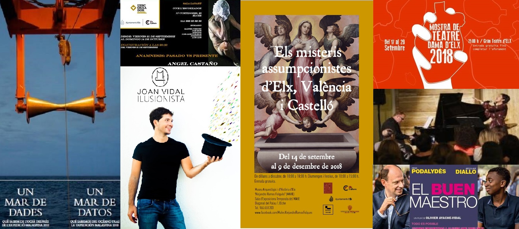 En cuanto a las exposiciones de entrada gratuita, desde el 14 de septiembre, se puede visitar “Els misteris assumpcionistes d’Elx, València i Castelló”, en la sala de exposiciones temporales del MAHE, de lunes a sábado de 10.00 a 18.00 horas, y de 10.00 a 15.00 horas los domingos y festivos. Además, hasta el 14 de octubre, se puede visitar en la sala de la Orden Tercera (al lado de la Iglesia de San José) la muestra “Un mar de datos”, de martes a sábado, de 10.00 a 14.00 y de 15.00 a 18.00 horas, y de 10.00 a 14.00 horas los domingos y festivos. Por otra parte, desde el viernes 21 de septiembre y hasta el 14 de octubre, en la sala Lanart de L’Escorxador, se puede visitar la muestra, “Amnesis: pasado vs presente”, de 17.00 a 20.00 horas de lunes a viernes, de 11.00 a 14.00 y de 17.00 a 20.00 horas los sábados, y de 11.00 a 14.00 horas los domingos y festivos.
