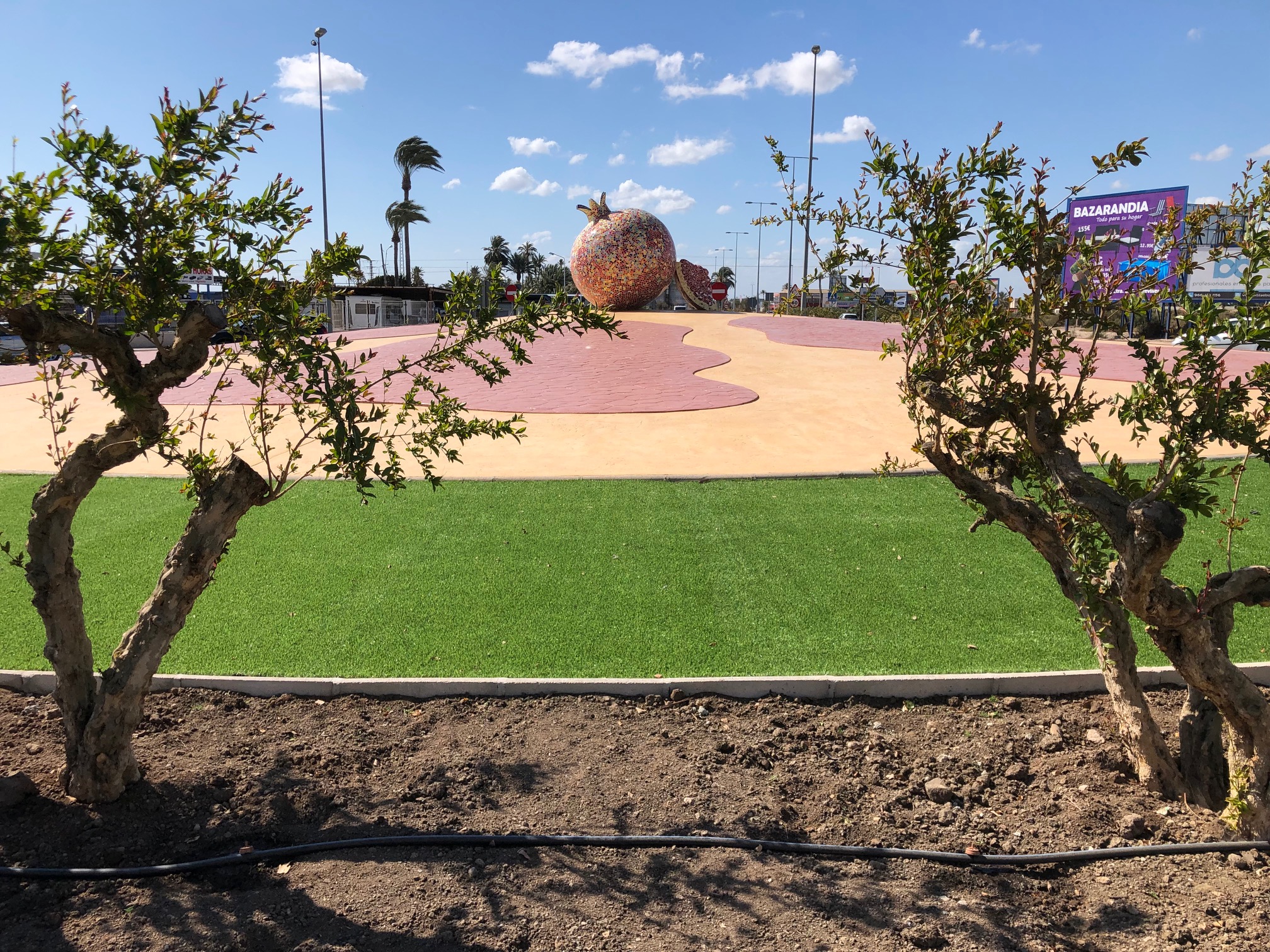 “A mediados de enero tuvimos una reunión con el presidente del sindicato de regantes del Trasvase Tajo-Segura y con el presidente de Riegos de Levante en la que estuvimos hablando de la importancia que este trasvase ha tenido para el Camp d’Elx. Tras 40 años, el trasvase ha supuesto no solo agua, también progreso y prosperidad para nuestra ciudad y para el campo ilicitano. Vimos conveniente que en este 40 aniversario, además de organizar juntos algunas actividades, queríamos que hubiera una representación de la importancia que ha tenido el trasvase. Así encargamos a un funcionario municipal que creara un icono representativo del campo y del trasvase y el resultado es esta magnífica granada de trencadís con una policromía realmente bella”, ha explicado el alcalde quien ha añadido “esta rotonda queremos que sea un icono que representa la importancia que tiene el campo en nuestro municipio, un producto autóctono como la granada y un factor de progreso como el trasvase Tajo-Segura”.