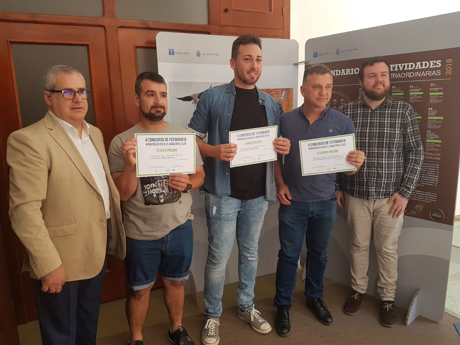 Antonio García y el gerente de Aigües d’Elx han entregado los galardones a: Martín Morales Terol (primer premio, de 500 euros); Francisco Manuel Haro Jiménez (segundo premio, de 250 euros); Óscar Vegas Lafuente (tercer premio, de 100 euros). La temática propuesta ha permitido presentar imágenes muy variadas y que ponen de manifiesto las diferentes formas y ocasiones en las que el agua está presente en El Clot, como se puede apreciar en el recorrido de la muestra.