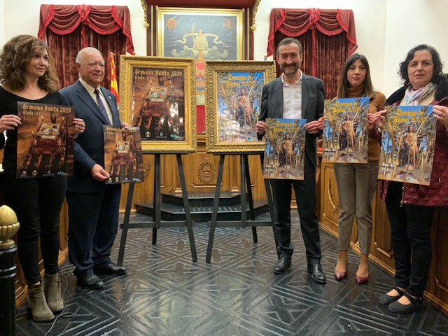 El alcalde, Carlos González, la concejala de Fiestas, Mariola Galiana, y el concejal de Turismo, Carles Molina, han presentado en el Salón de Plenos del Ayuntamiento los carteles anunciadores de la Semana Santa y Domingo de Ramos 2020