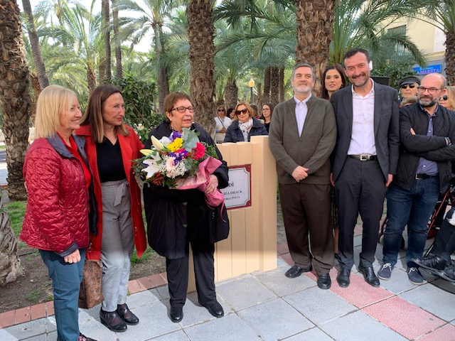 Ana María Drack ya tiene su jardín en el corazón del Palmeral. Los familiares y amigos, muchos de ellos referentes de la cultura ilicitana se han dado cita en el Filet de Fora para asistir a la inauguración del jardín que desde hoy va a llevar el nombre de a la cantautora, escritora, poetisa y actriz ilicitana.