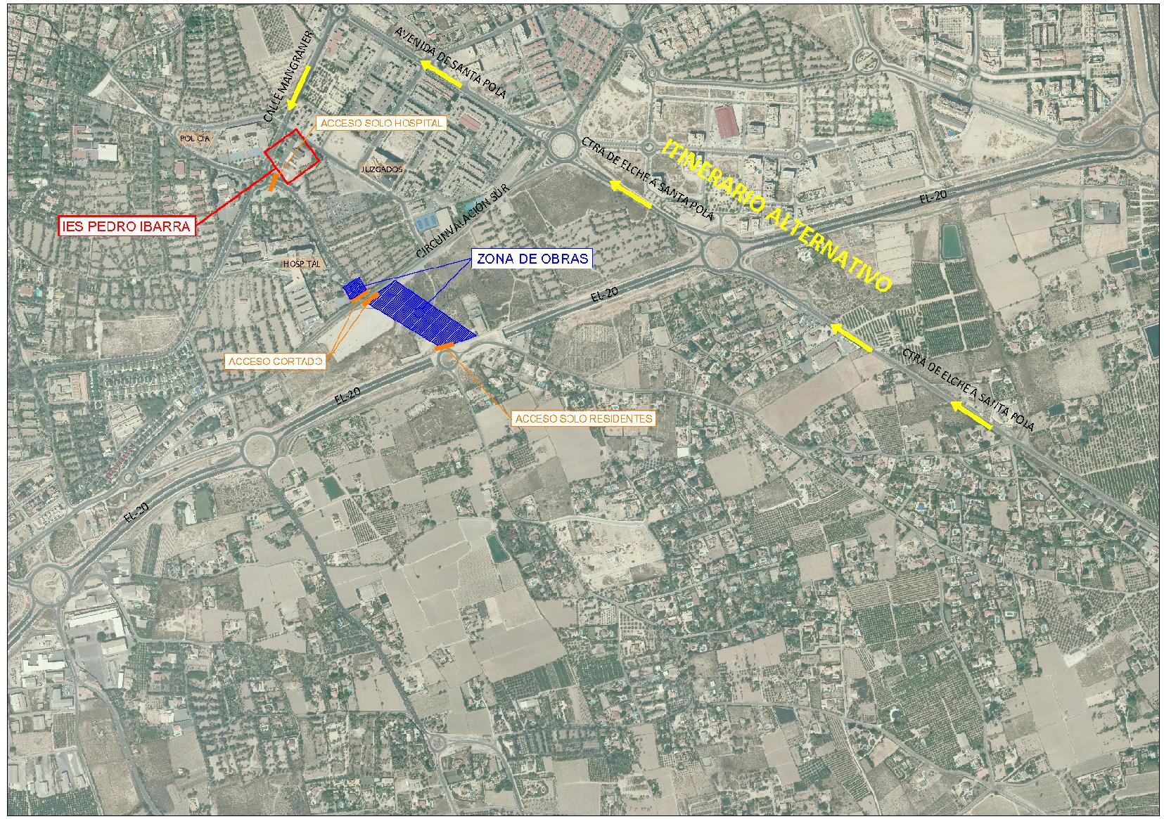Hasta esta fecha, para acceder al Hospital, comisaria de policía, juzgados, institutos, colegios y otras ubicaciones en el eje de las calles Teulada y Mangraner, se recomiendan itinerarios que utilicen la carretera de Santa Pola CV-865 y la Avenida de Santa Pola.