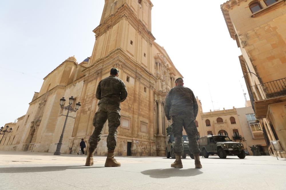 Unidades del Ejército de Tierra están revisando infraestructuras estratégicas en Elche en el marco del despliegue organizado por el gobierno en distintas localidades del país con el fin de concienciar a los ciudadanos sobre la expansión del coronavirus y como medida preventiva en colaboración con el Ministerio del Interior.