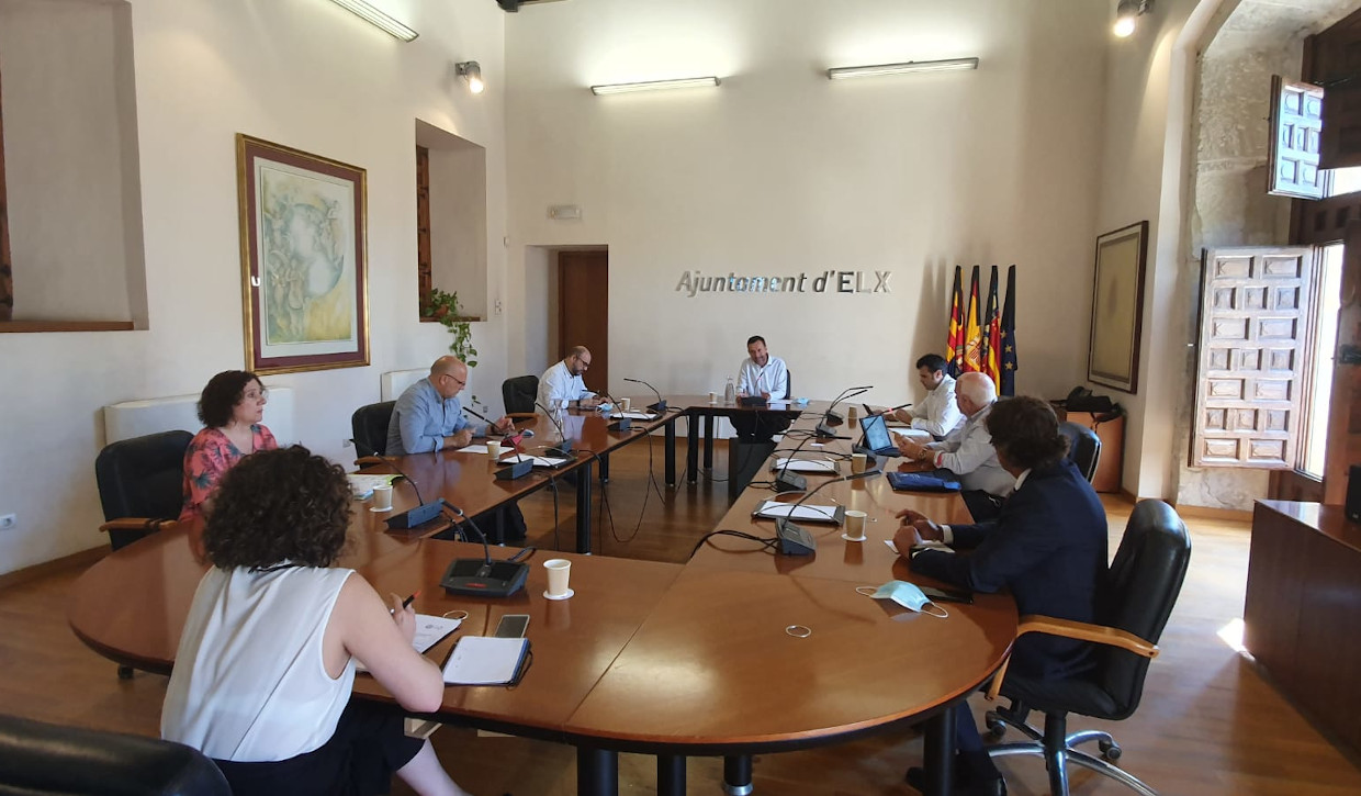 El Ayuntamiento de Elche ha dado un nuevo paso dirigido a estudiar las actuaciones prioritarias para la recuperación económica y social del municipio con la puesta en marcha de cuatro mesas de diálogo, en las que, junto a los agentes sociales, definirán las medidas que permitirán paliar los efectos negativos de la covid-19. El alcalde de Elche, Carlos González, y los concejales de Promoción Económica, Carles Molina, y de Comercio, Felip Sànchez, se han vuelto a reunir esta mañana con los responsables de UGT, Ismael Senent, CC.OO, Carmen Palomar, y directivos del Circulo Empresarial de Elche y Comarca (CEDELCO) presidido por Joaquín Pérez.
