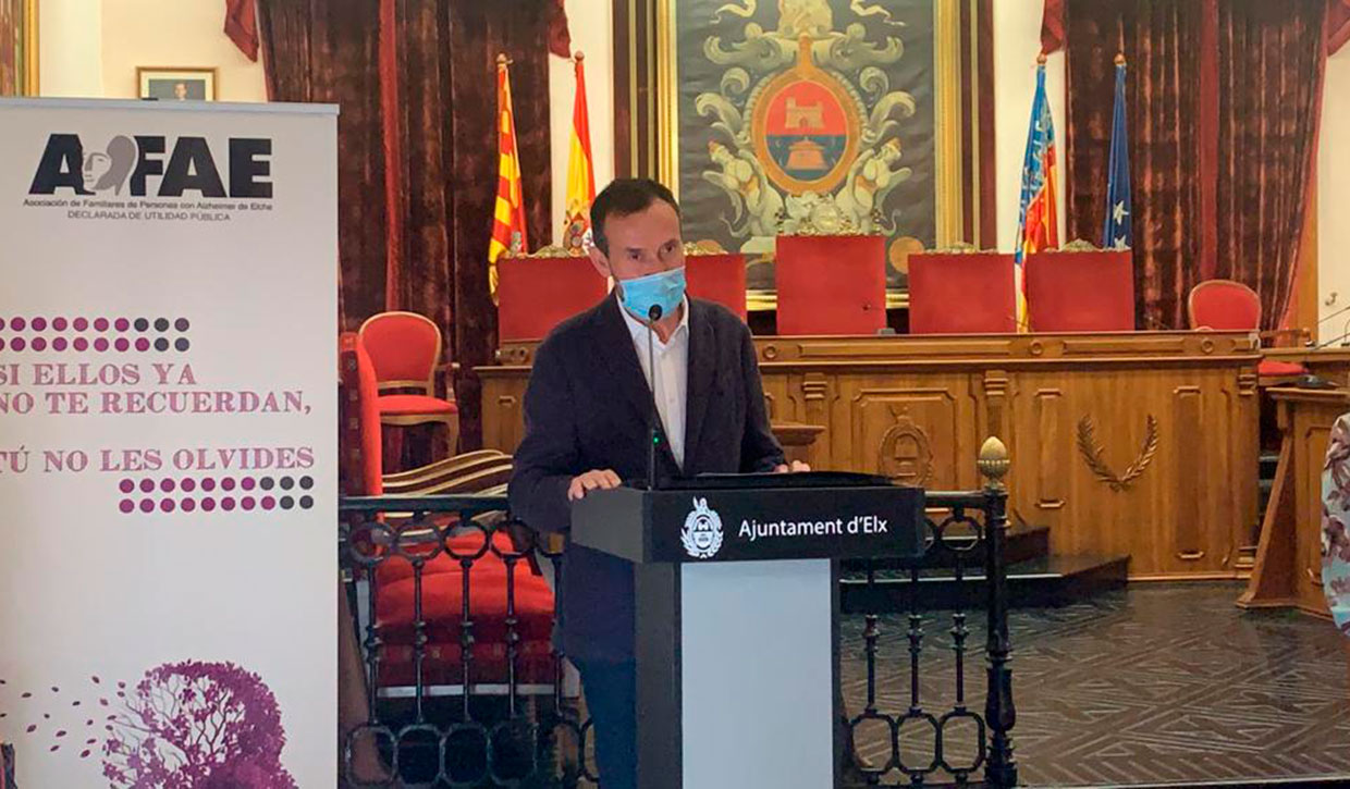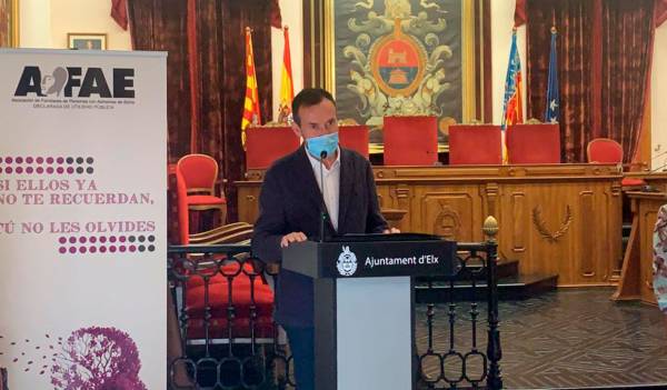 Con motivo del Día Mundial del Alzheimer, este 21 de septiembre el Ayuntamiento de Elche y la Asociación de Familiares de Personas con Alzheimer (AFAE) se han sumado a la lectura del manifiesto “La dependencia fuera de la ley” de la Confederación Española de Alzheimer (CEAFA) en el Salón de Plenos. “AFAE es esencial para nuestra ciudad porque trabajáis para uno de los colectivos que más padece vulnerabilidad frente al covid-19”, ha destacado el alcalde, Carlos González, acompañado del concejal de Derechos Sociales, Mariano Valera, la edil de Sanidad, Mariola Galiana, miembros de la Corporación Municipal y del Equipo de Gobierno.