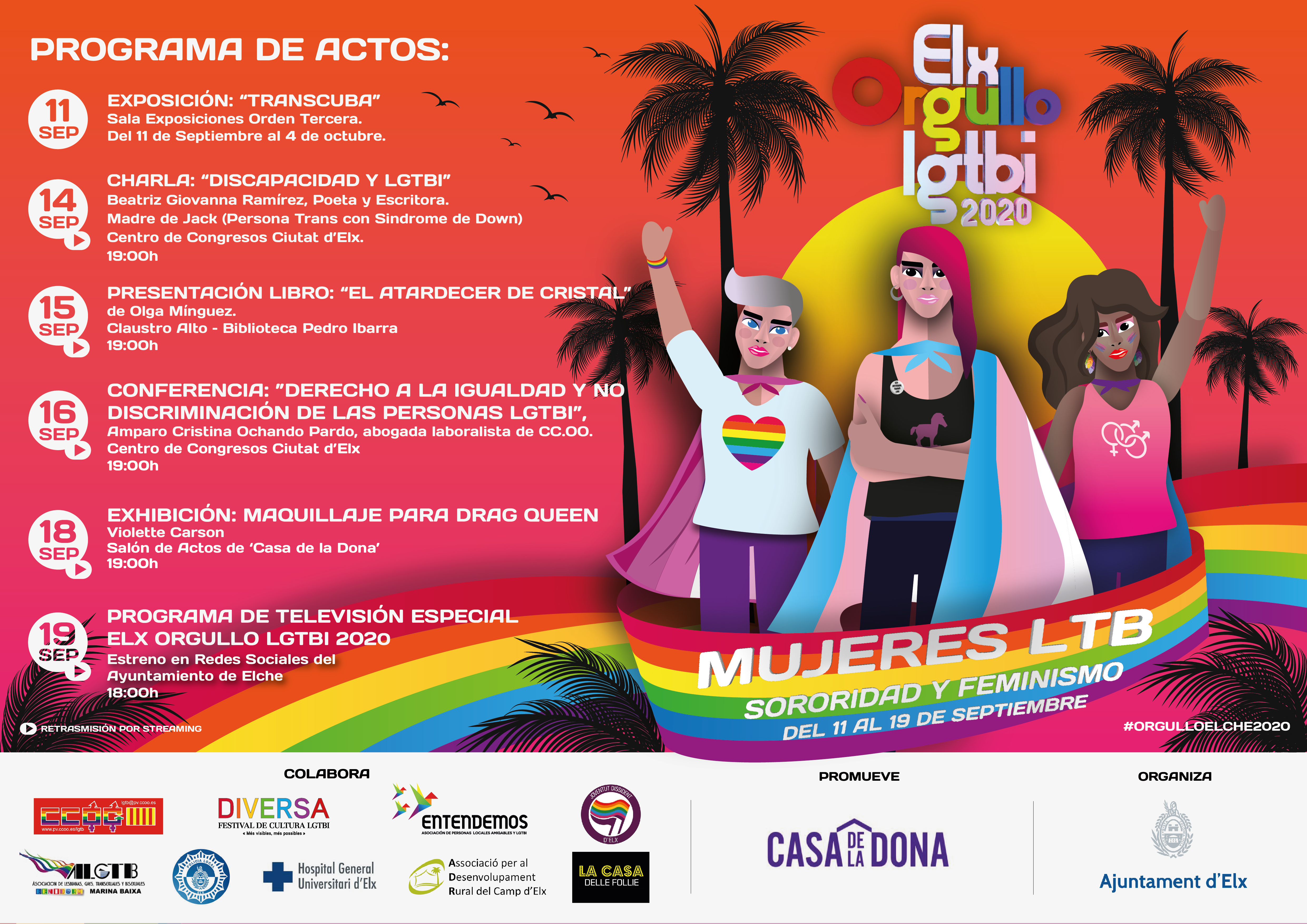 El acto central de la celebración dirigida a reivindicar los derechos del colectivo, cuya presente edición se dedica a visibilizar a las mujeres LTB, transcurrirá el sábado 19 de septiembre, a partir de las 18:00 horas, a través de las redes sociales del Consistorio ilicitano
