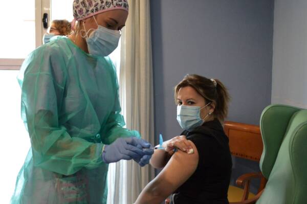 Tras la vacunación de los dos primeros residentes se ha procedido a vacunar a la primera profesional del centro, la Gobernanta, María Teresa Muñoz Ruíz, que no ha podido evitar emocionarse tras recibir la vacuna “la esperábamos con mucha ilusión y me emociona por los residentes y los momentos que hemos vivido. Quiero animar a todo el mundo a que se la ponga”, ha explicado.