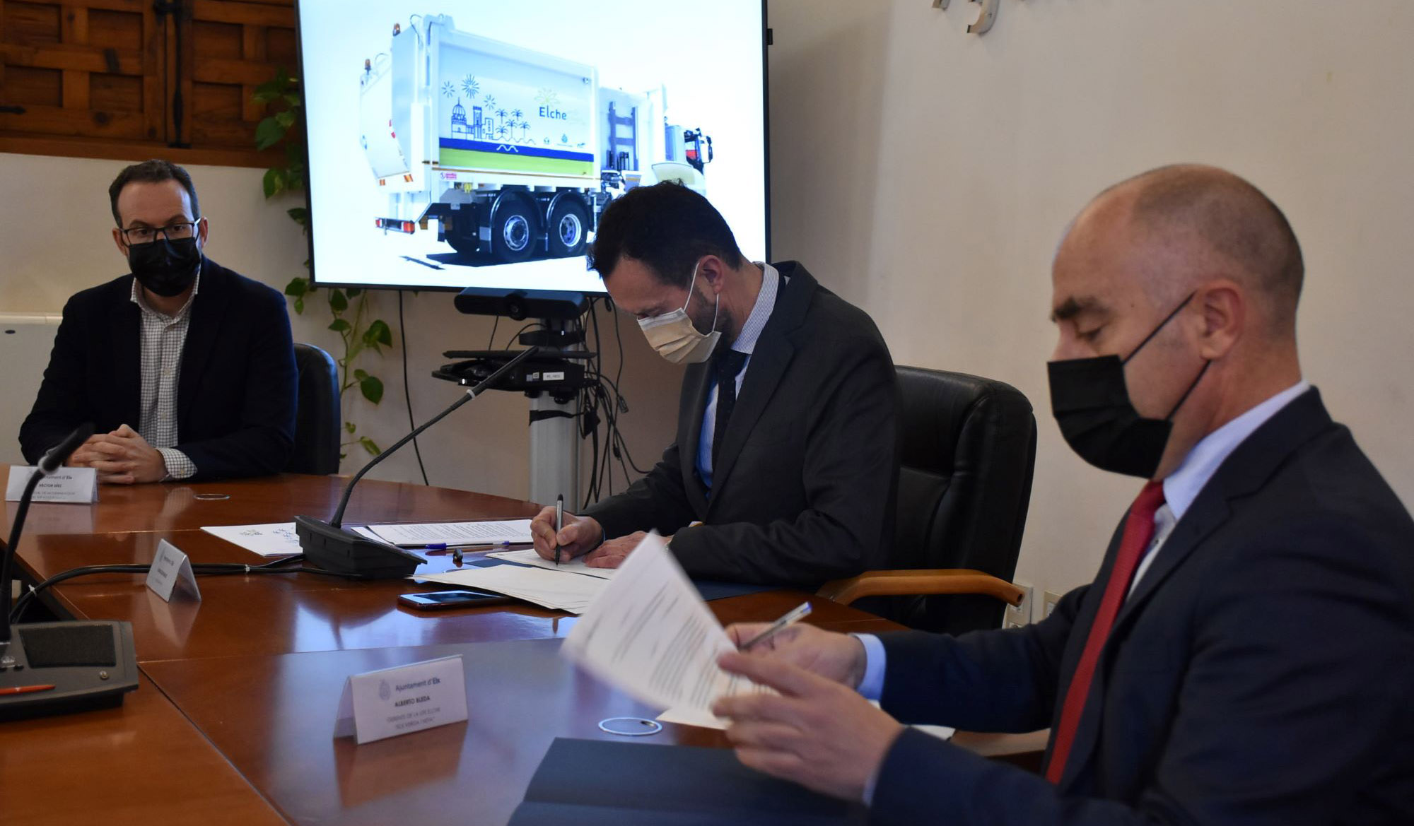 Junto al alcalde han estado en la firma el concejal de Limpieza y Modernización del Espacio Público, Héctor Díez, el gerente de la UTE Elche, Alberto Bleda, el delegado de zona de Urbaser, Ángel La Orden, el delegado de zona de FCC, Ángel Garcillán, el presidente del comité de empresa, Francisco Carrasco, y el ingeniero municipal Luis Tebar.
