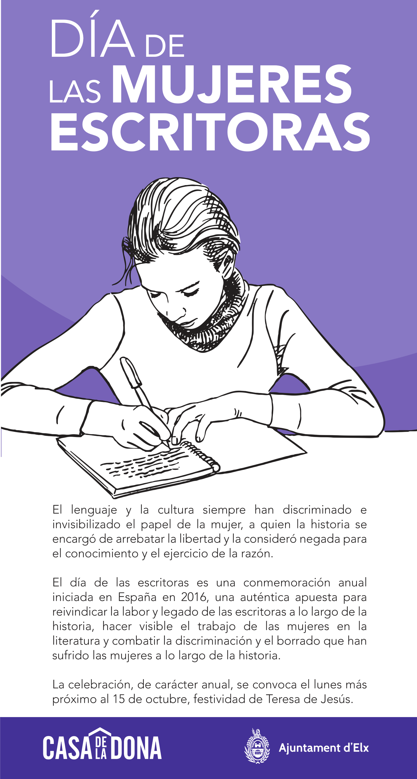 La concejalía de Igualdad, a través de Casa de la Dona Elche, ha puesto a disposición de los centros educativos del municipio la exposición “Mujeres Escritoras” con la finalidad de divulgar y poner en valor el papel de la mujer en el mundo intelectual. Una muestra consistente en 9 rollers con ficha biográfica de mujeres españolas escritoras de renombre. Los interesados tendrán que rellenar el documento de cesión y enviarlo a igualdad@elche.es