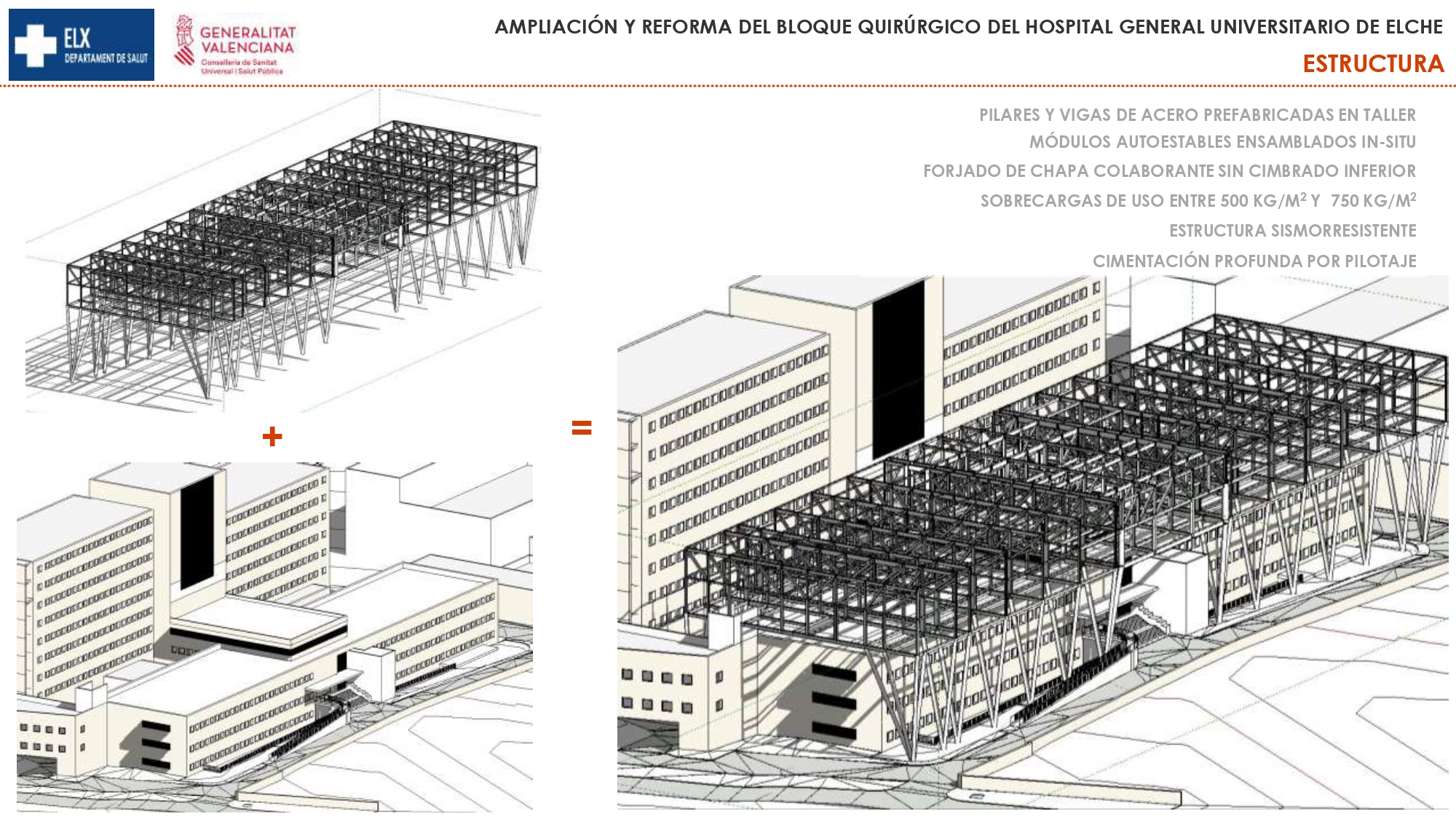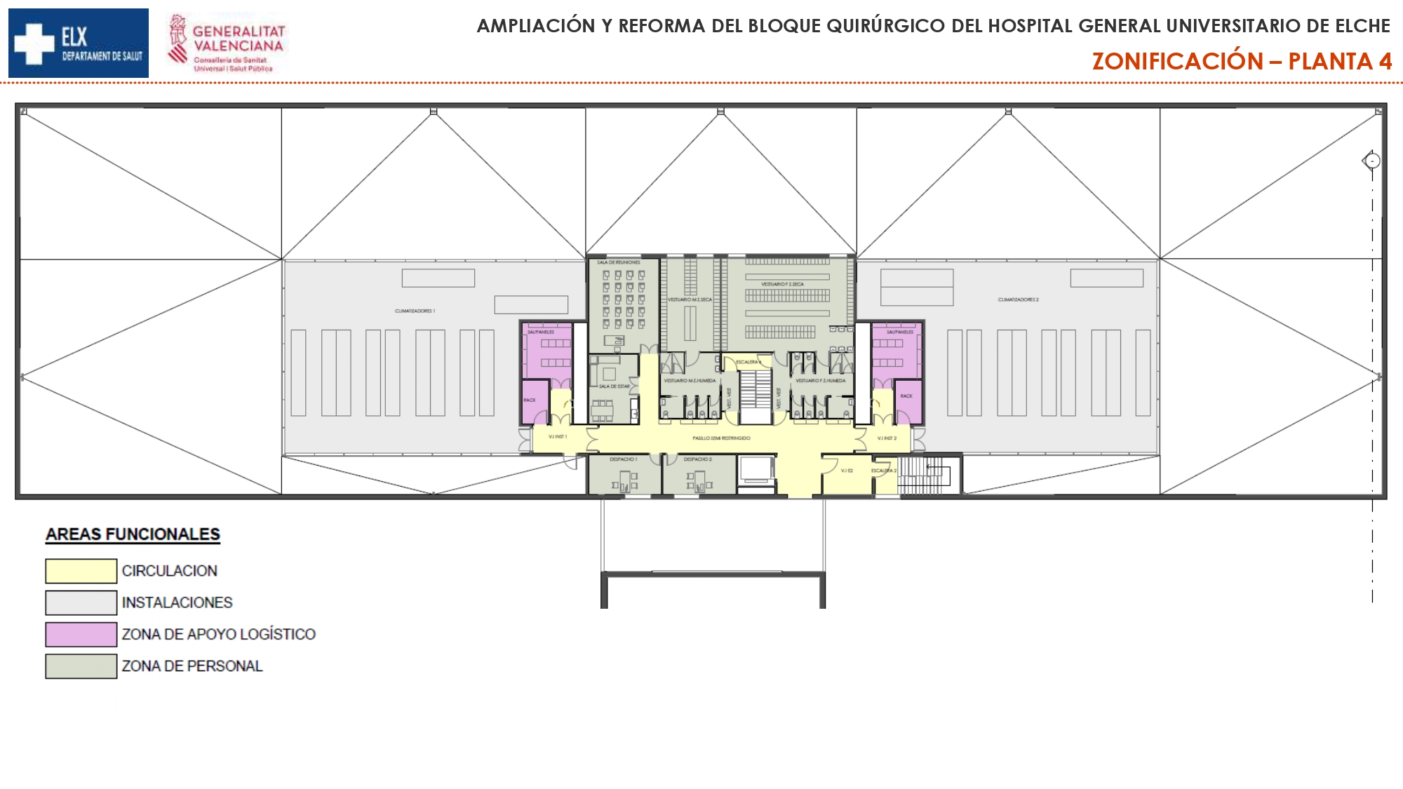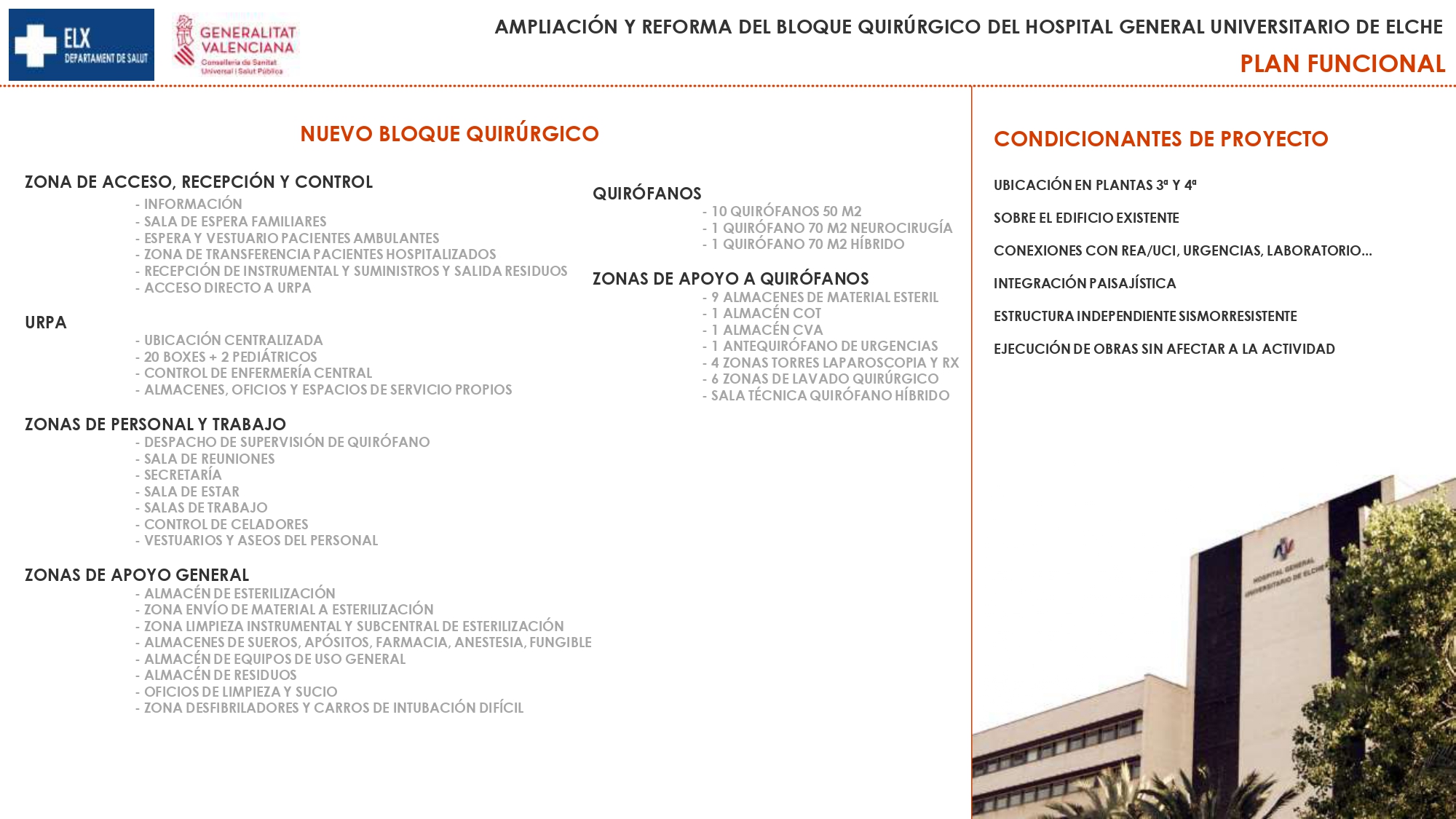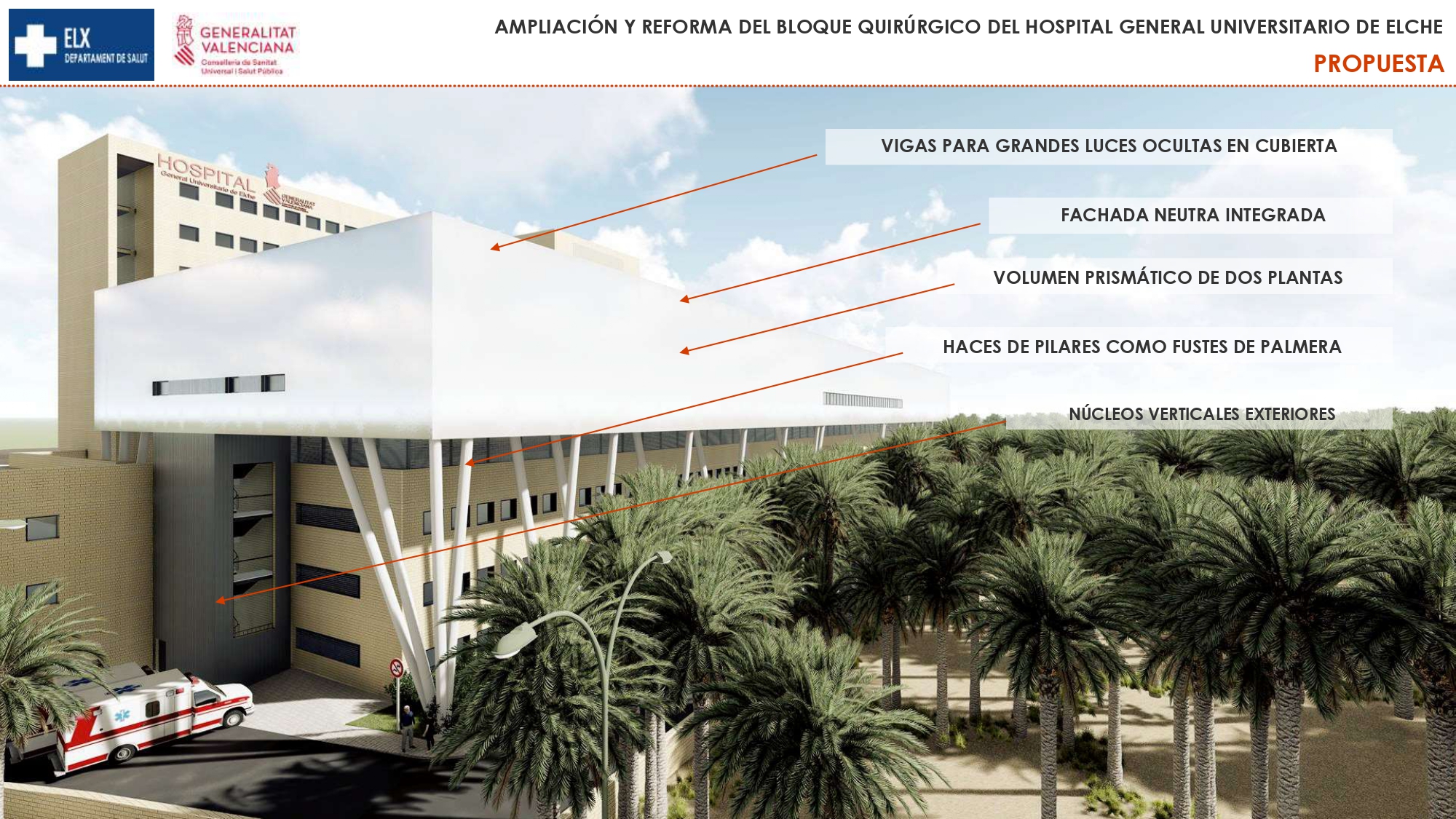 La obra que hoy comienza y cuyo final está previsto para el segundo semestre de 2023 contempla la ejecución de un nuevo volumen sobre el bloque norte existente. En este nuevo elemento, de dos plantas, se distribuye el nuevo Bloque Quirúrgico con trece quirófanos y todas sus áreas anexas.
