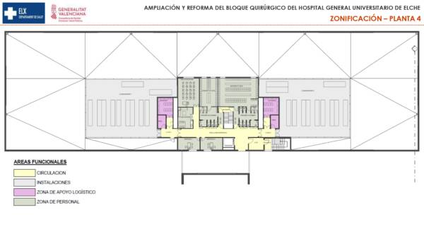 En la primera planta se ubicarán 13 quirófanos (1 de ellos híbrido), una Unidad de Recuperación Post Anestésica (con 20 boxes para adultos y dos boxes pediátricos), zona de apoyo de quirófanos, zona de apoyo logístico y zona de personal (almacenes, despachos, aseos, etc ).