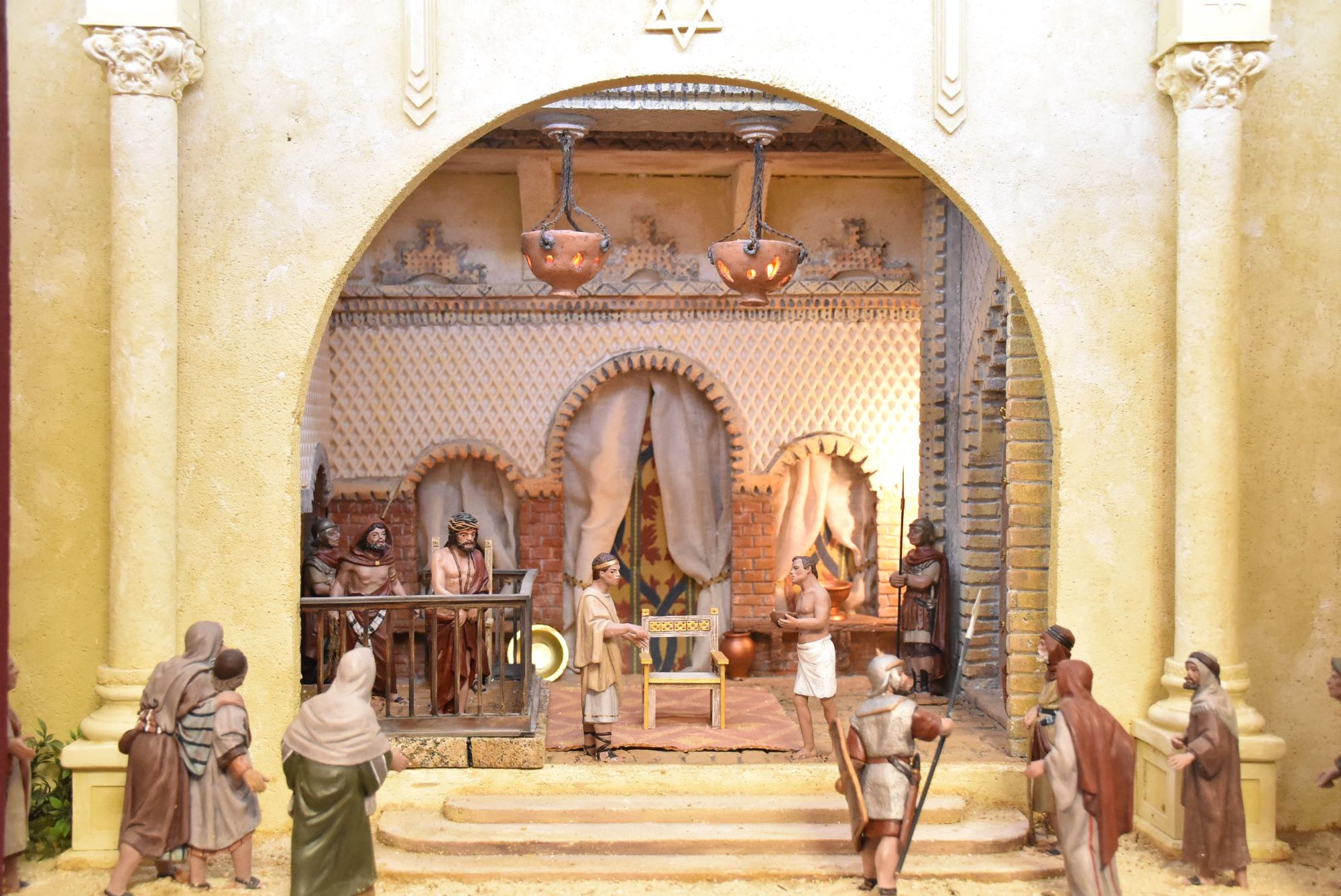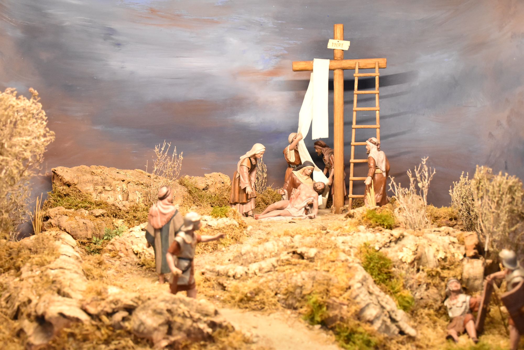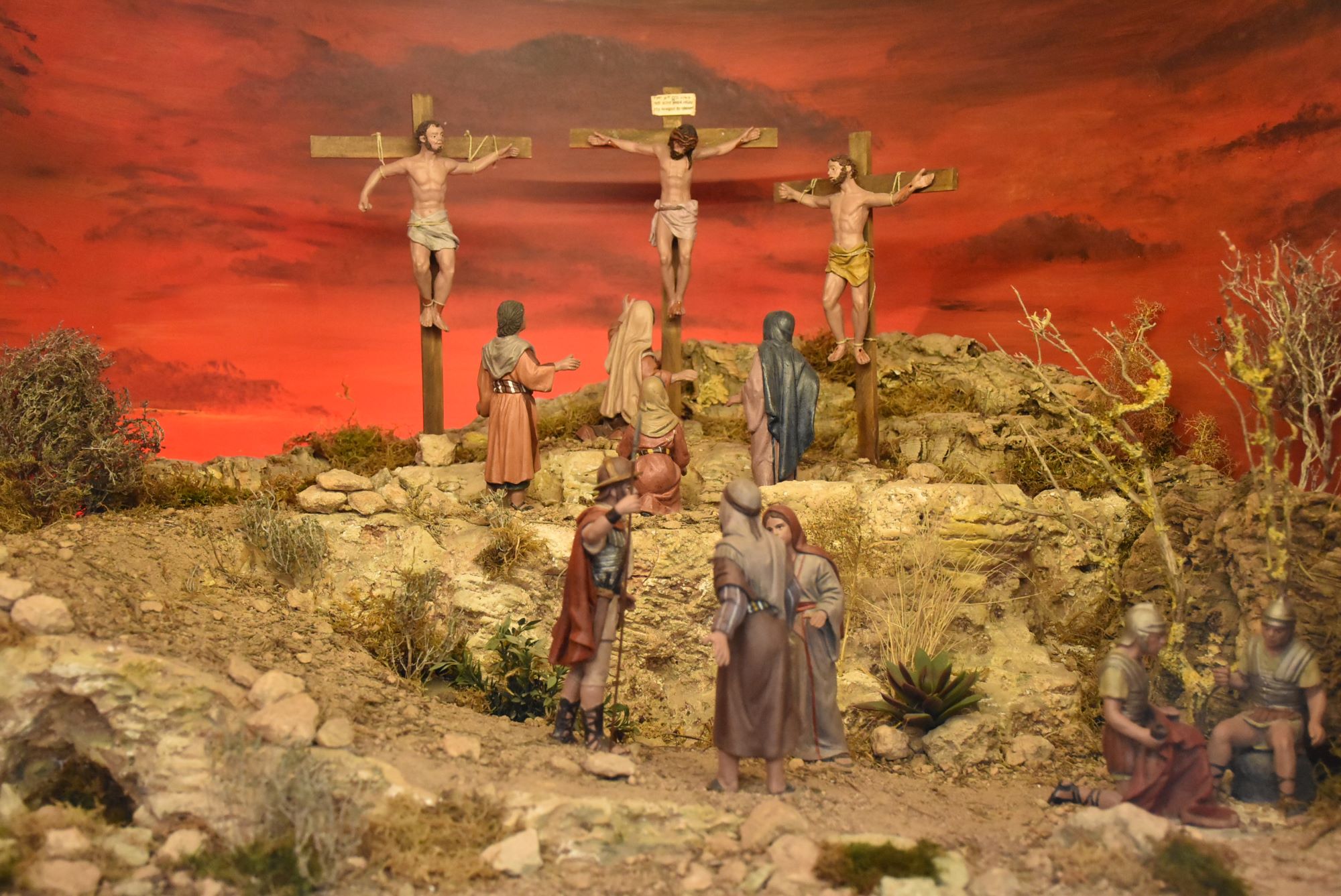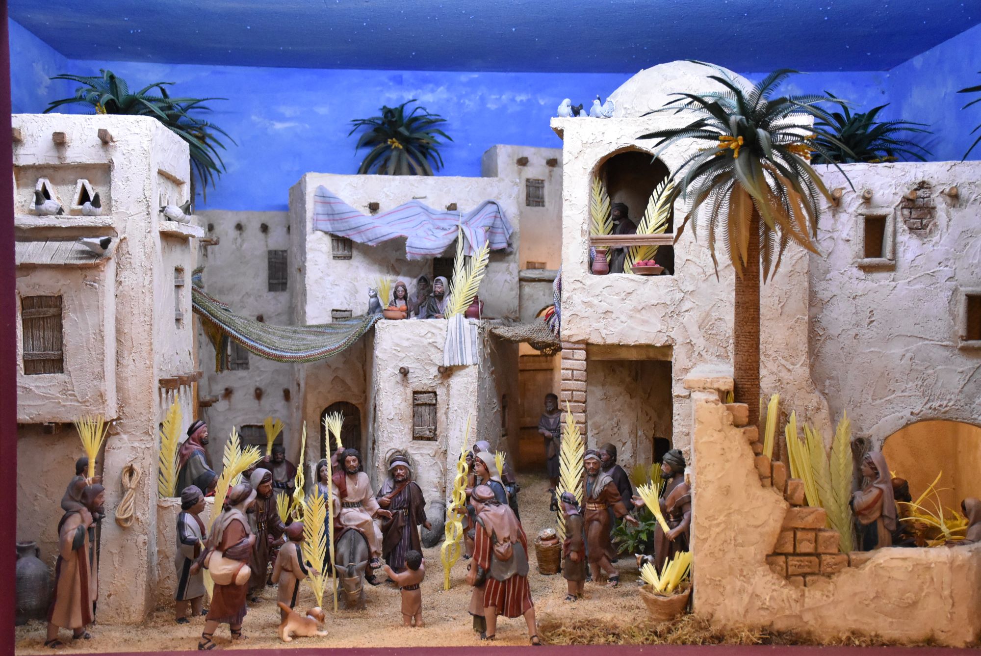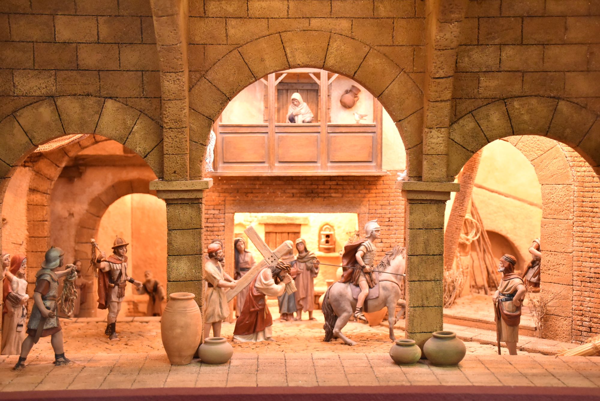 Esta muestra está compuesta por siete escenas en formato de diorama que representa diferentes momentos de la Pasión, como la Entrada en Jerusalén, el Monte Calvario o el Santo Sepulcro. En la escena del Domingo de Ramos se ha representado las palmas mediante miniaturas trenzadas por una componente de la Asociación con palma blanca natural.