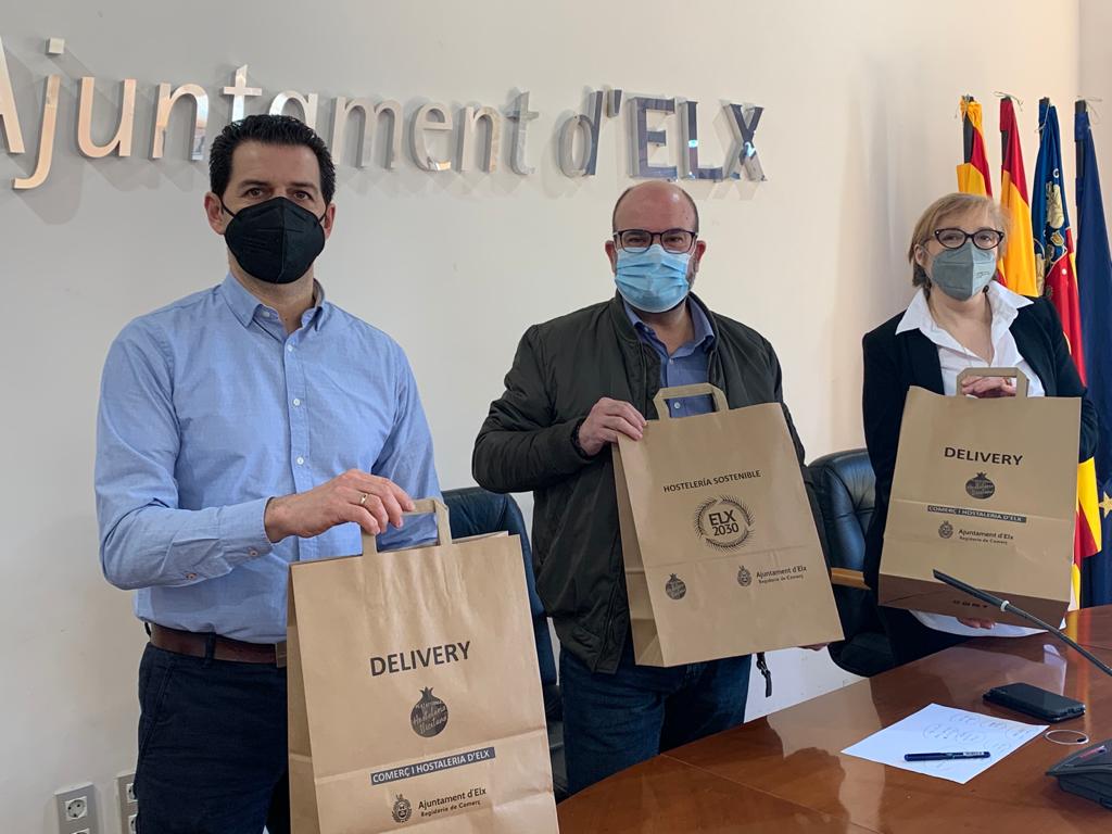 La Concejalía de Comercio colabora junto a la Plataforma de Hostelería Iliciatana en la distribución de 15.000 bolsas ecológicas para repartir comida a domicilio. La campaña ha sido presentada esta mañana por el concejal de Comercio, Felip Sànchez, junto a la presidenta de la Plataforma de Hostelería Ilicitana, Paqui Solves, y junto al vicepresidente de esta plataforma, Fran Mora.