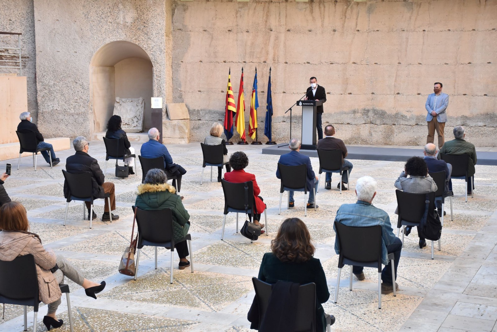 El Ayuntamiento de Elche ha reconocido esta tarde la labor desempeñada por 19 funcionarios que se han jubilado este año. El alcalde de Elche, Carlos González, y el edil de Recursos Humanos, Ramón Abad, han asistido a este acto, que habitualmente se celebra en el Salón de Plenos y que hoy se ha trasladado al Patio de Armas del Palacio de Altamira para garantizar las medidas de seguridad frente al covid-19.