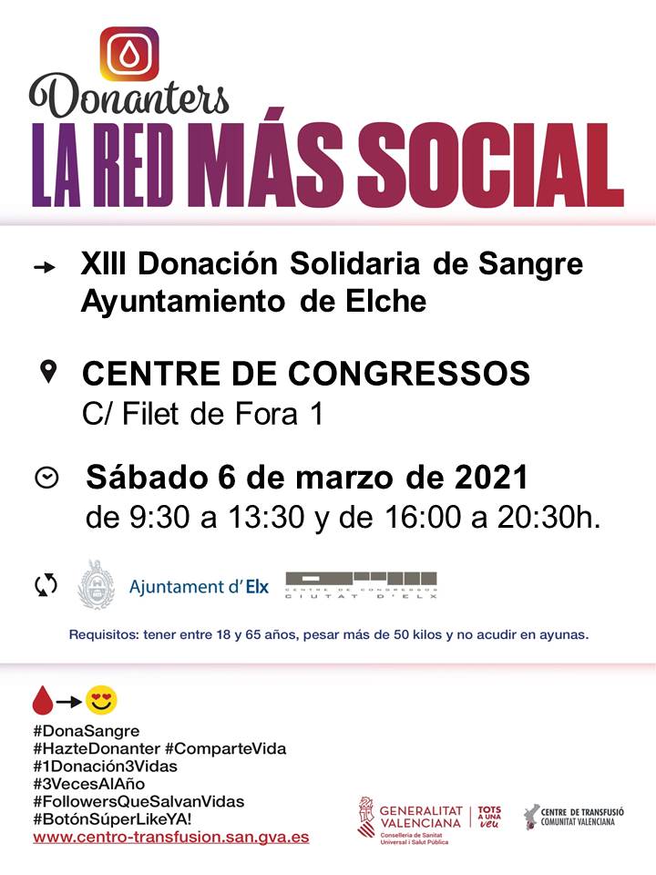 El Ayuntamiento de Elche y el Centro de Transfusión de la Comunitat Valenciana (CTCV) organizan para el sábado, día 6, la XIII Maratón donación de sangre Ciutat d’Elx. Este evento solidario tendrá lugar en el Centro de Congresos de la ciudad en horario de 9:30 a 14:00 horas y de 16:00 a 21:00 horas.
