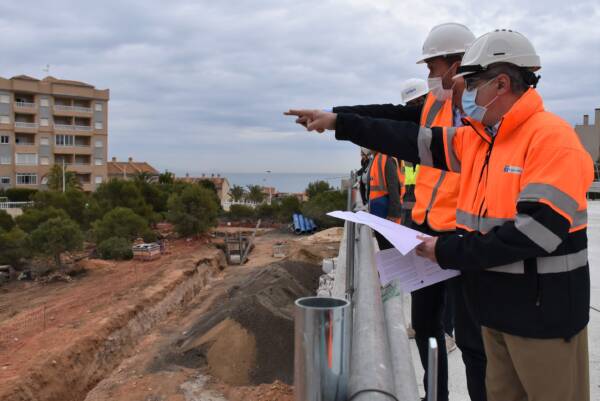 El alcalde, Carlos González, los concejales de Agua, Héctor Díez, y de Pedanías, Vicente Alberola, el gerente de Aigües d’Elx, Javier Prieto, y los pedáneos de Arenales del Sol, Antonio Garzón, y El Altet, José Manuel Meseguer, visitan los trabajos de dicho servicio que entrará en funcionamiento a mediados de junio