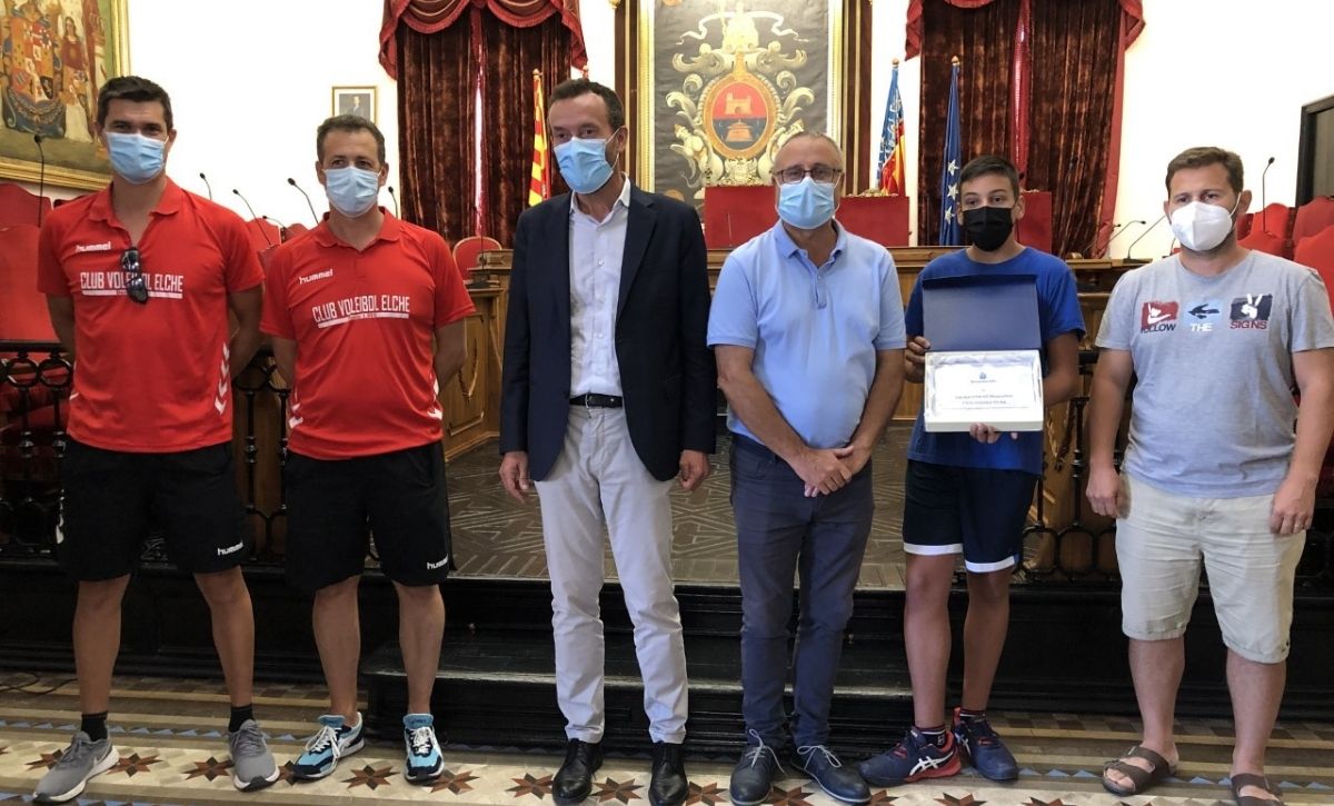 El alcalde de Elche, Carlos González, y el concejal de Deportes, Vicente Alberola, han recibido en el Salón de Plenos del Ayuntamiento al equipo cadete masculino del Club Voleibol Elche – Salesianos que recientemente se ha proclamado Campeón de España.