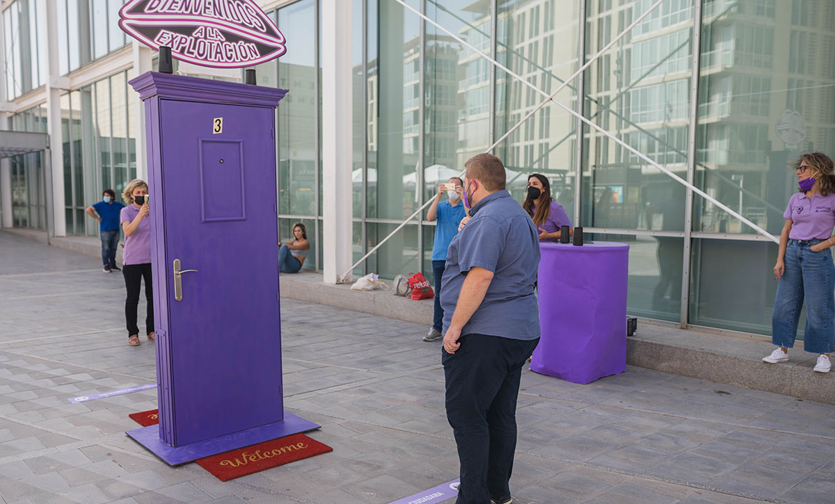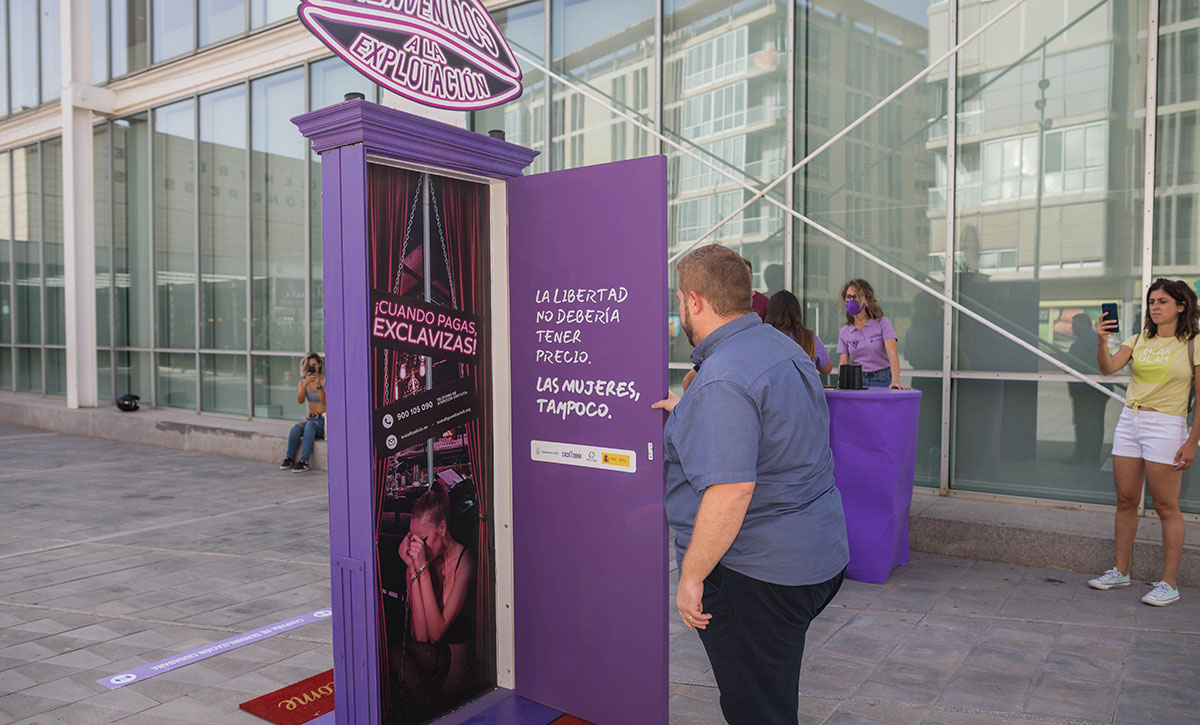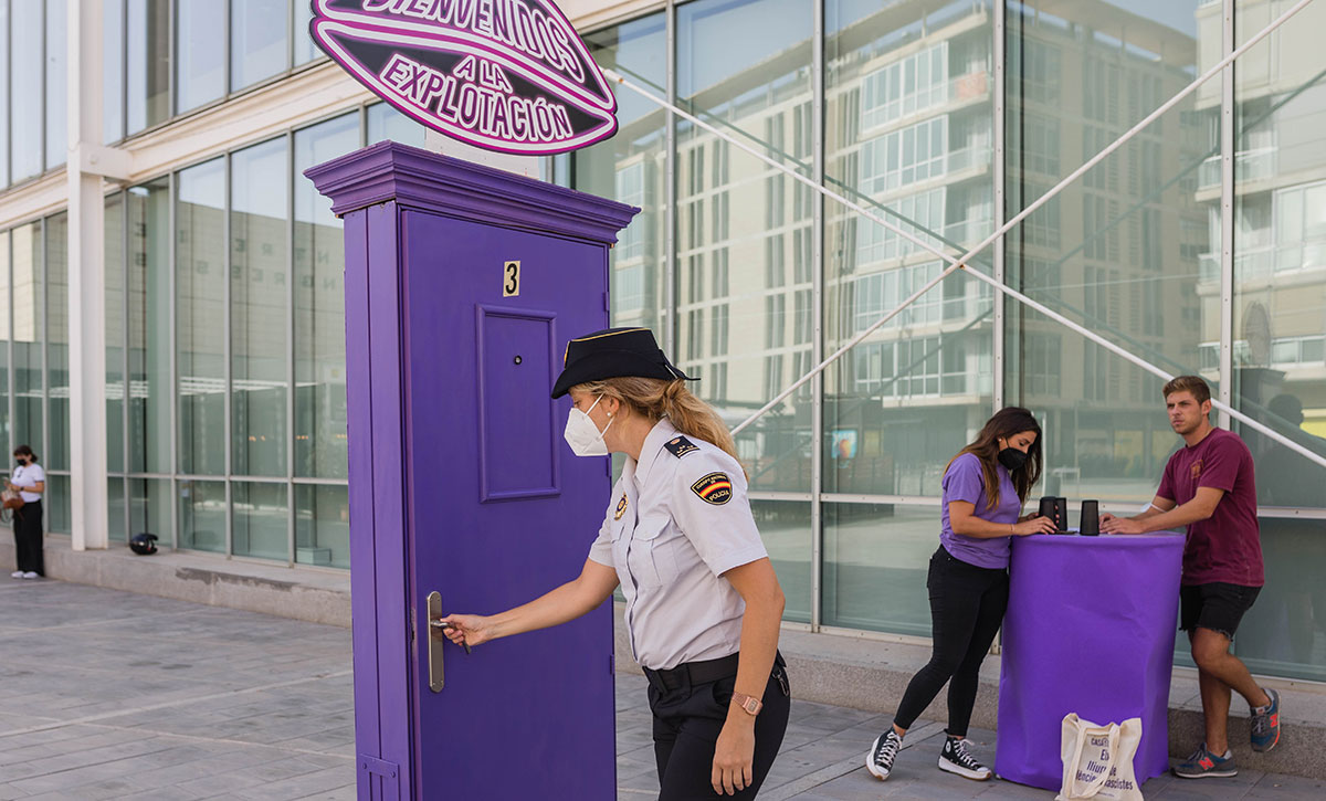 La acción de street marketing consiste en una puerta morada que simula el acceso a un burdel. Al abrirla, se reproduce una locución en off de una víctima real de la industria del sexo. En concreto, el crudo testimonio en diferido del periplo de una chica eslava que es traída engañada para someterla al meretricio. Y es que, tras la búsqueda del entretenimiento adulto en calles, pisos y clubs, se halla una realidad sórdida de violación constante de los derechos más básicos de las mujeres prostituidas. Por ello, dentro de la puerta se encuentra el número de teléfono y los correos electrónicos donde las protagonistas de este Día Internacional, las víctimas, pueden pedir ayuda.