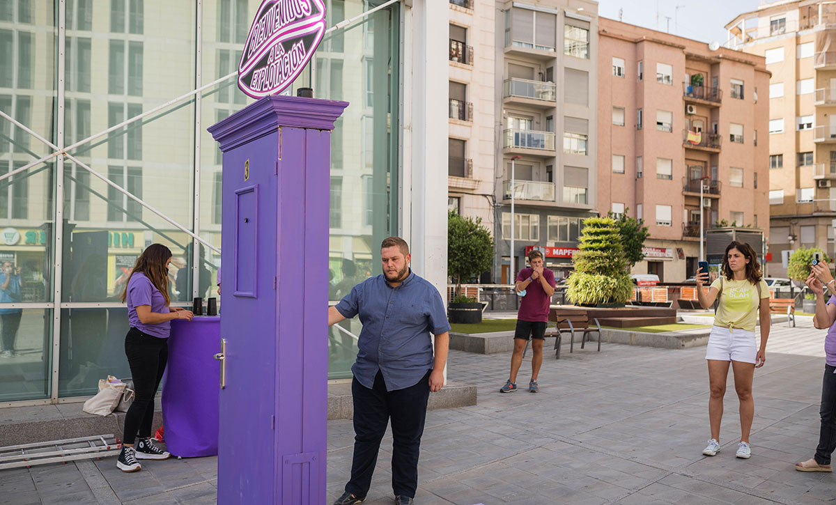 El edil Mariano Valera invita a la ciudadanía a escuchar el crudo testimonio incluido en esta atrevida acción de ‘street marketing’ que simula la entrada de un burdel