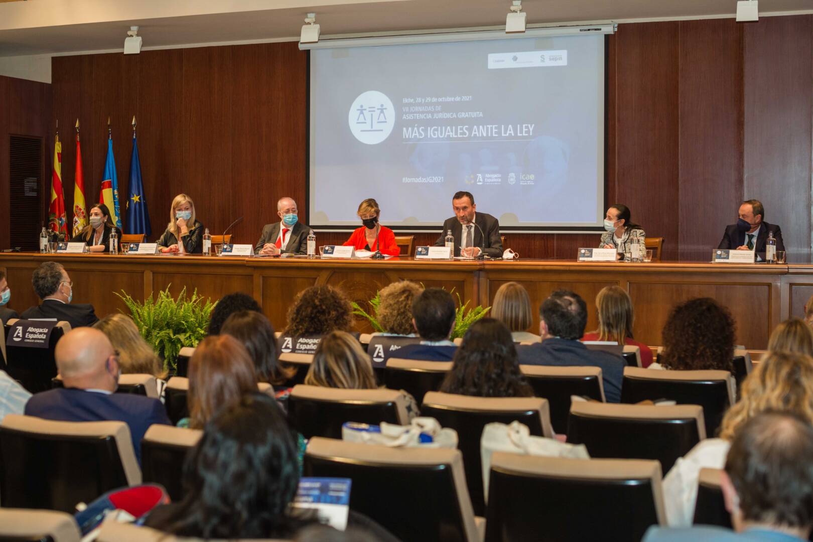 Las VII Jornadas de Asistencia Jurídica Gratuita ‘Más Iguales ante la Ley’ reúnen en Elche, los días 28 y 29 de octubre, a profesionales y autoridades de la judicatura y de las fuerzas y cuerpos de seguridad del Estado para tratar, entre otros temas de interés, el nuevo reglamento de asistencia jurídica gratuita. La solemne inauguración ha tenido lugar a las 16:00 horas en la sede del Ilustre Colegio de Abogados de Elche (ICAE), a cargo del alcalde, Carlos González; la consellera de Justicia, Gabriela Bravo; la presidenta del Tribunal Superior de Justicia de la Comunitat Valenciana, Pilar de la Oliva; el decano del ICAE, Vicente Pascual; y la presidenta del Consejo General la Abogacía Española, Victoria Ortega.