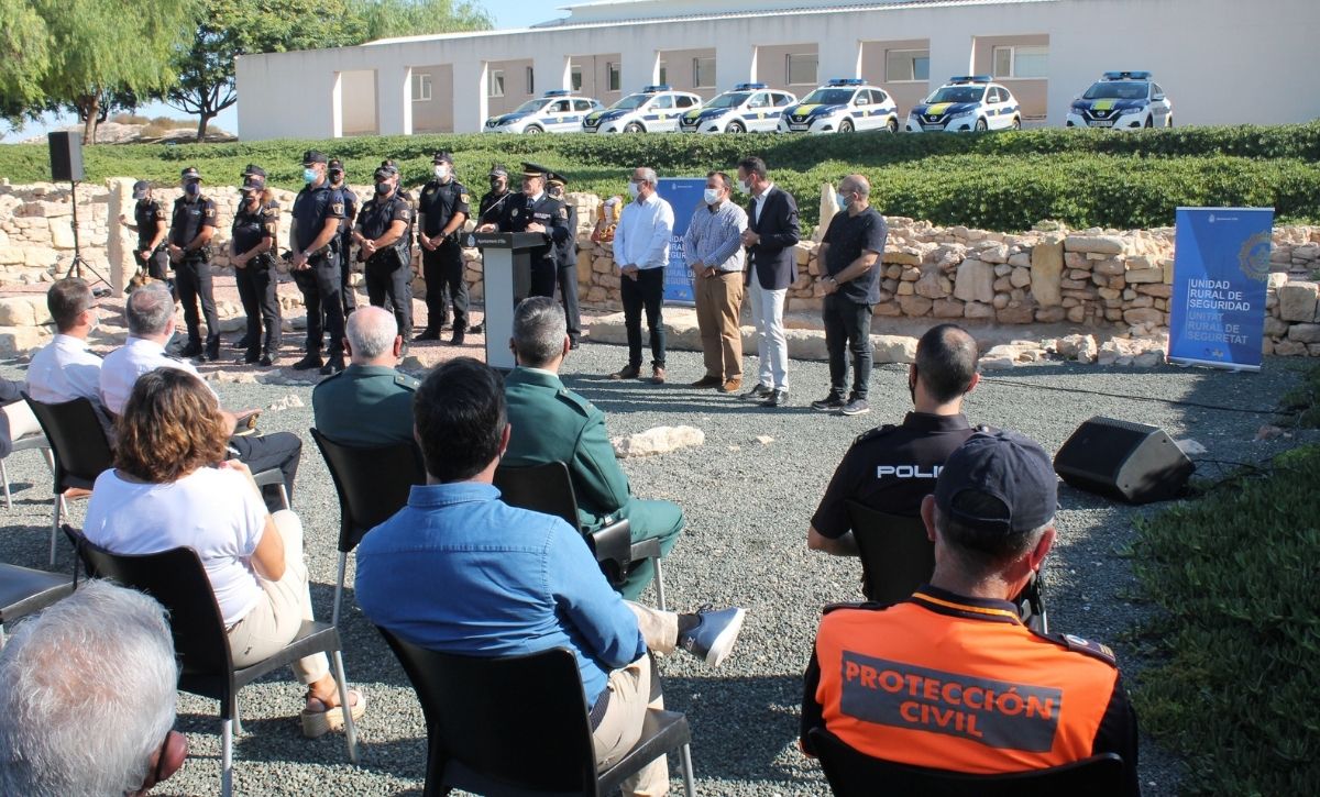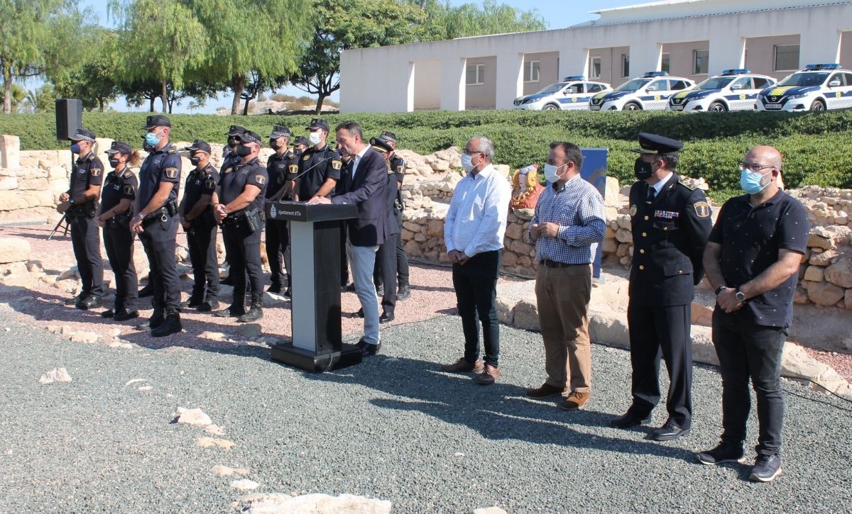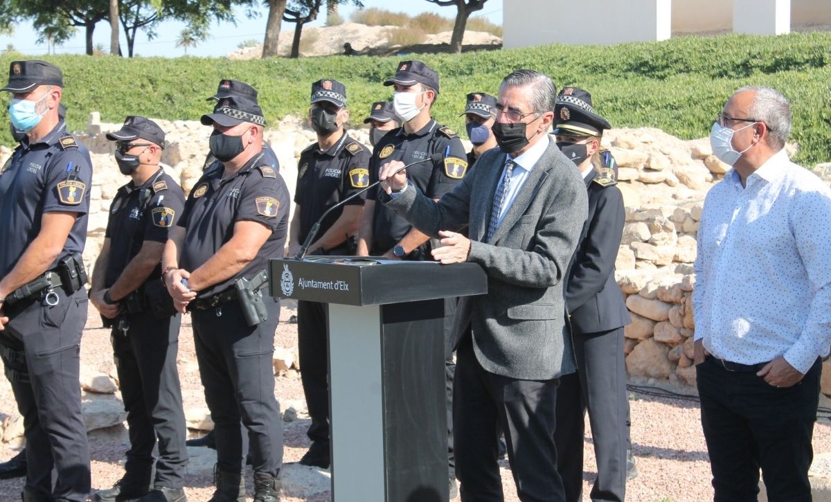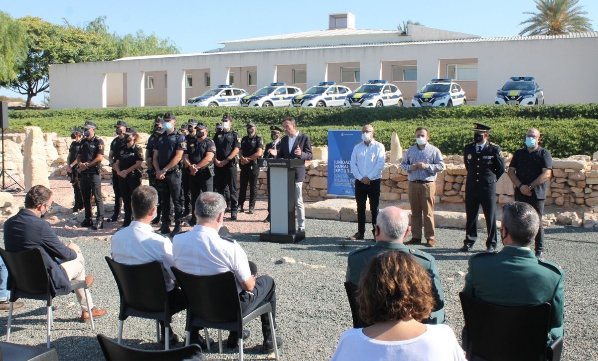 La Unidad Rural de Seguridad de la Policía Local de Elche ya es una realidad. El alcalde, Carlos González, acompañado por los ediles de Seguridad Ciudadana, de Pedanías y de Desarrollo Rural, Ramón Abad, Vicente Alberola y Felip Sànchez, del jefe de la Policía Local, César Zaragoza, y del secretario autonómico de Seguridad, José María Ángel Batalla, ha presentado esta mañana el destacamento en el yacimiento de La Alcudia. Con un presupuesto anual inicial de 520.600 euros, la nueva Unidad está compuesta por una docena de agentes –que ascenderán a 18 a principios de 2022 y podrían sobrepasar dicha cifra si es preciso, según González–, dos oficiales y un inspector, que velarán a partir de hoy, de manera exclusiva, por el bienestar y la seguridad de los vecinos y las vecinas de la treintena de pedanías y partidas rurales que integran el Camp d’Elx.