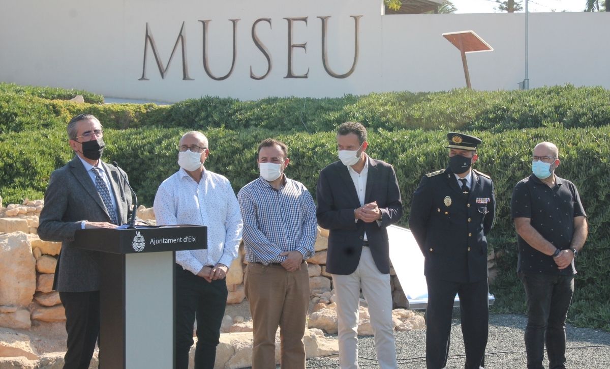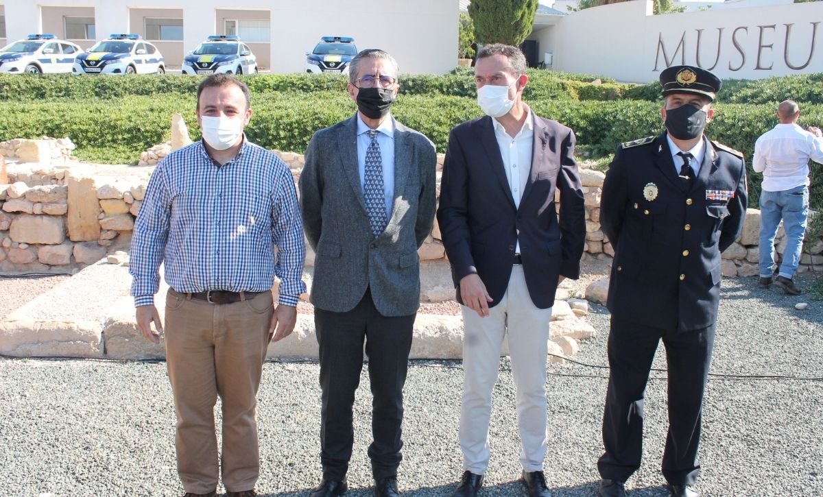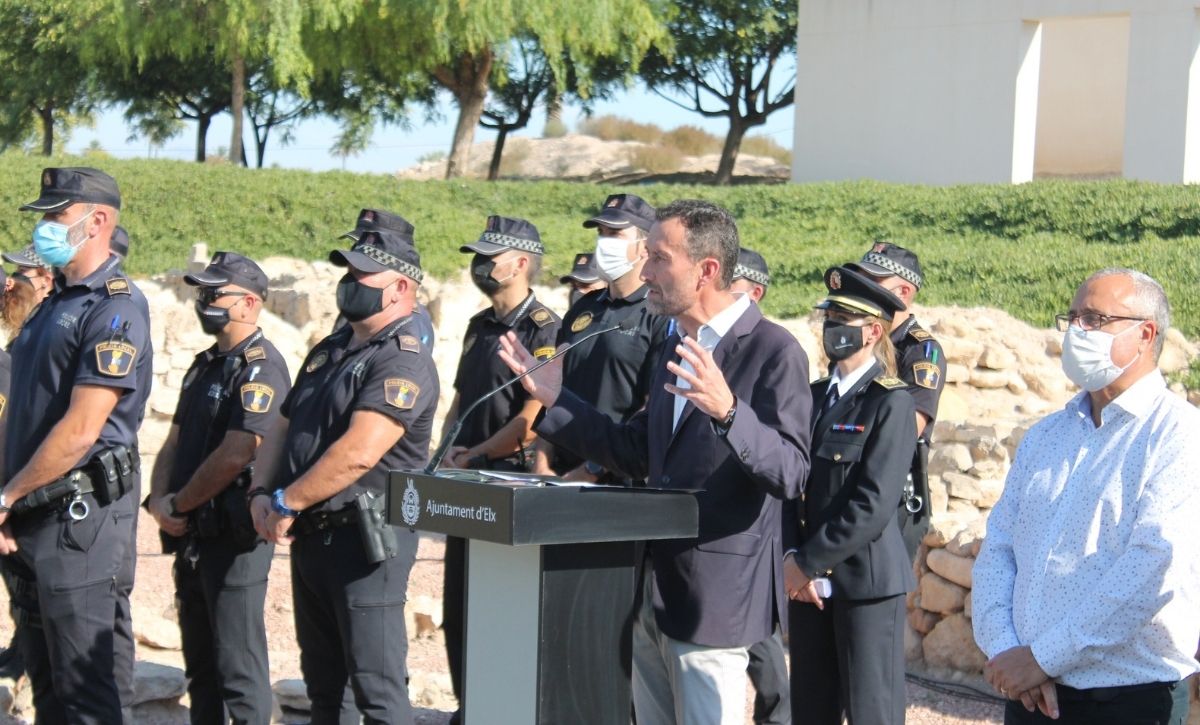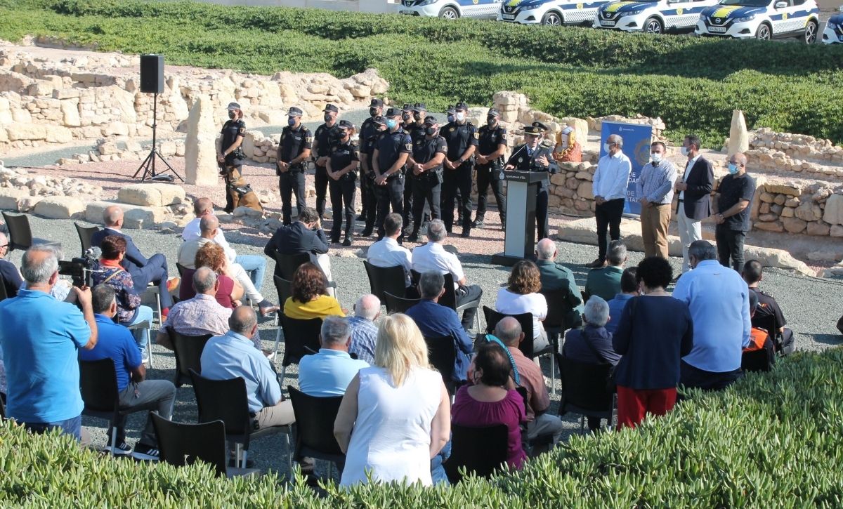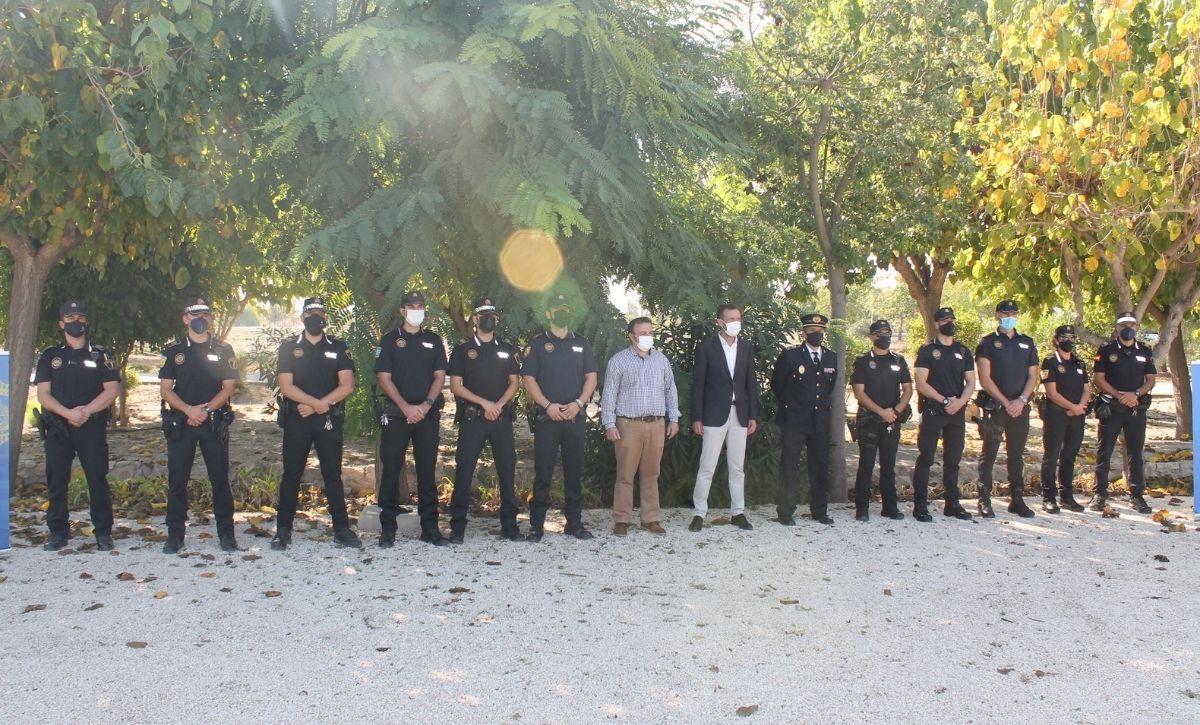 La Unidad Rural de Seguridad de la Policía Local de Elche ya es una realidad. El alcalde, Carlos González, acompañado por los ediles de Seguridad Ciudadana, de Pedanías y de Desarrollo Rural, Ramón Abad, Vicente Alberola y Felip Sànchez, del jefe de la Policía Local, César Zaragoza, y del secretario autonómico de Seguridad, José María Ángel Batalla, ha presentado esta mañana el destacamento en el yacimiento de La Alcudia. Con un presupuesto anual inicial de 520.600 euros, la nueva Unidad está compuesta por una docena de agentes –que ascenderán a 18 a principios de 2022 y podrían sobrepasar dicha cifra si es preciso, según González–, dos oficiales y un inspector, que velarán a partir de hoy, de manera exclusiva, por el bienestar y la seguridad de los vecinos y las vecinas de la treintena de pedanías y partidas rurales que integran el Camp d’Elx.
