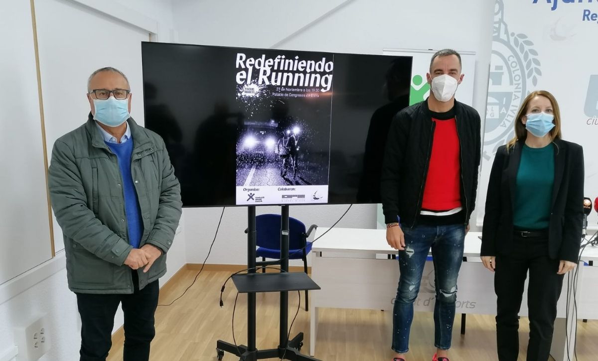El edil de Deportes, Vicente Alberola, el corredor y miembro de Pigeon Runner, Juan Carlos Esteso, y la presidenta de la Fundación del Deporte Ilicitano, Raquel Rosique, presentan la proyección «No hay… Corriendo de Madrid a Barcelona a relevos non stop» que tendrá lugar en el Centro de Congresos dentro de la jornada «Redefiniendo el running»