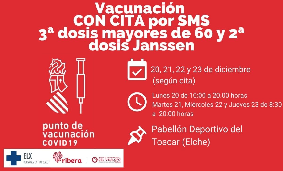 El Ayuntamiento de Elche habilitará del 20 al 23 de diciembre el Polideportivo de El Toscar para administrar dosis de refuerzo contra el covid-19 a personas de 60 a 64 años. Concretamente esta jornada, que cuenta con el apoyo de Salud Pública y la colaboración del Hospital General Universitario del Vinalopó y el Hospital General Universitario de Elche, también está dirigida a los vacunados con Janssen que no hayan recibido la segunda dosis.