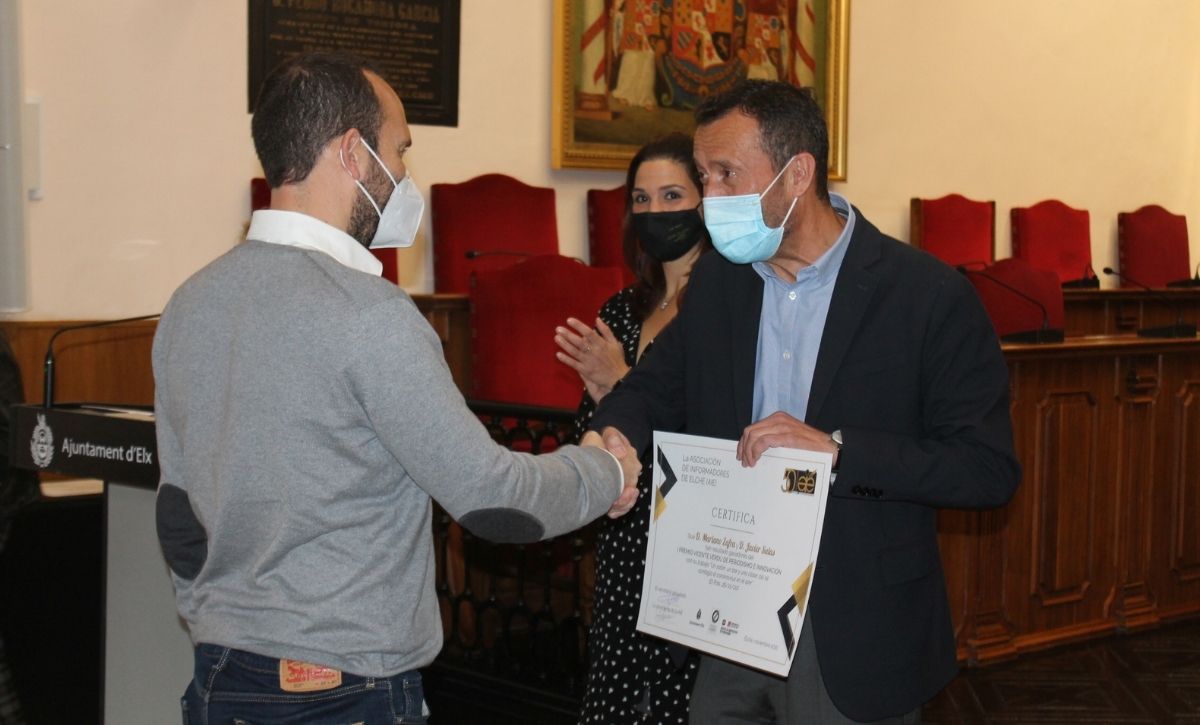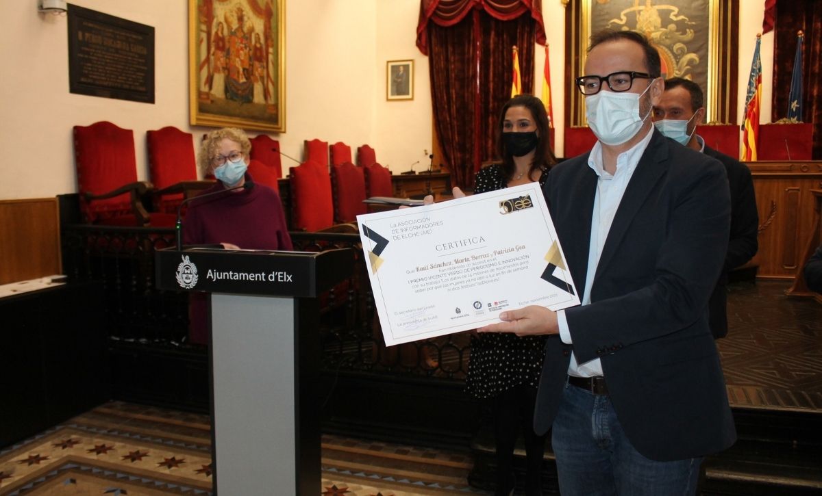 Mariano Zafra y Javier Salas, reporteros de El País, son los ganadores de la primera edición del Premio de Periodismo e Innovación ‘Vicente Verdú’ de Elche, una iniciativa de la Asociación de Informadores de Elche (AIE) en colaboración con el Ayuntamiento de Elche –que aporta íntegramente los 6.000 euros del premio– y del Máster de Innovación de Periodismo de la UMH. El Salón de Plenos del Consistorio ha acogido esta mañana el acto de entrega de galardones.