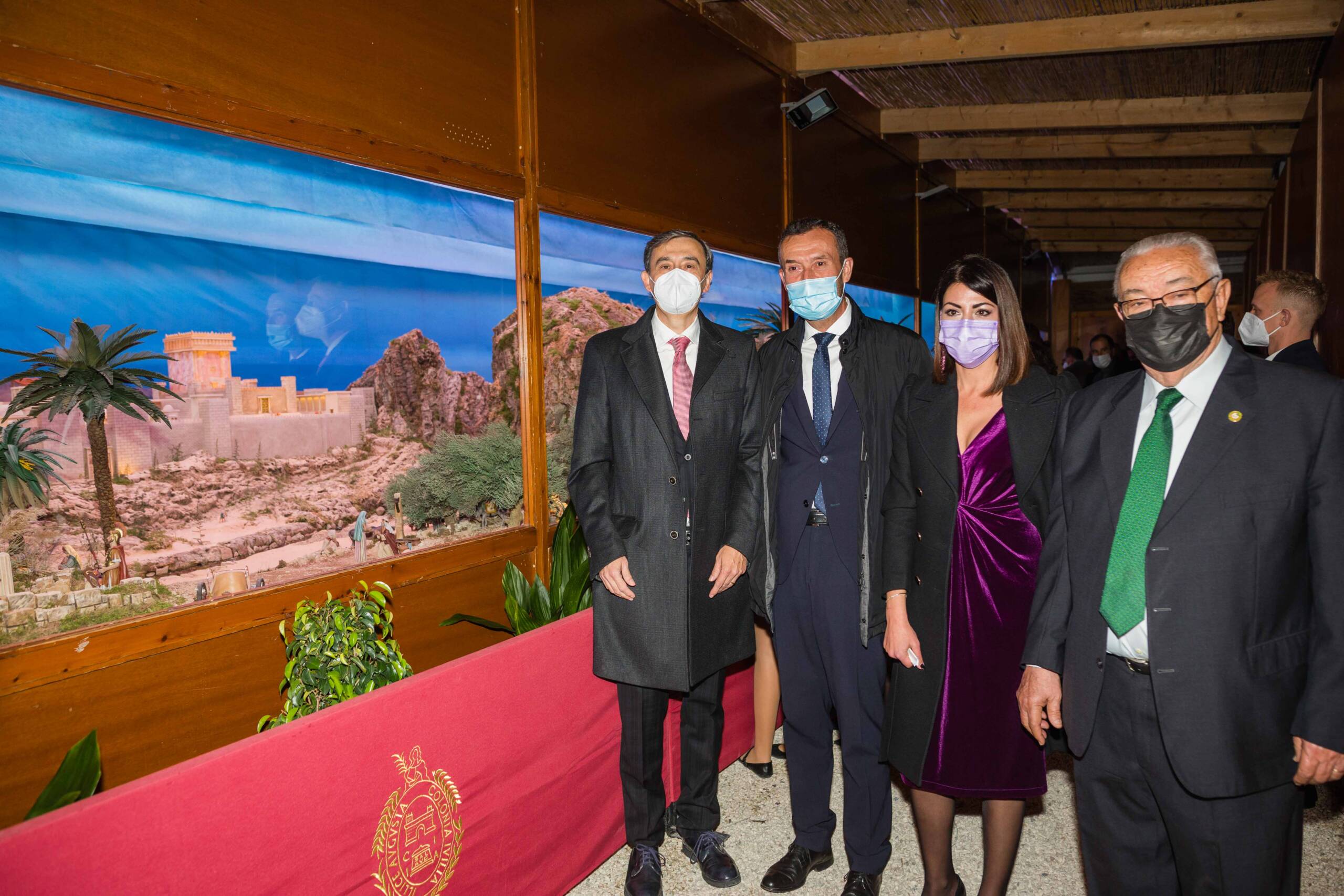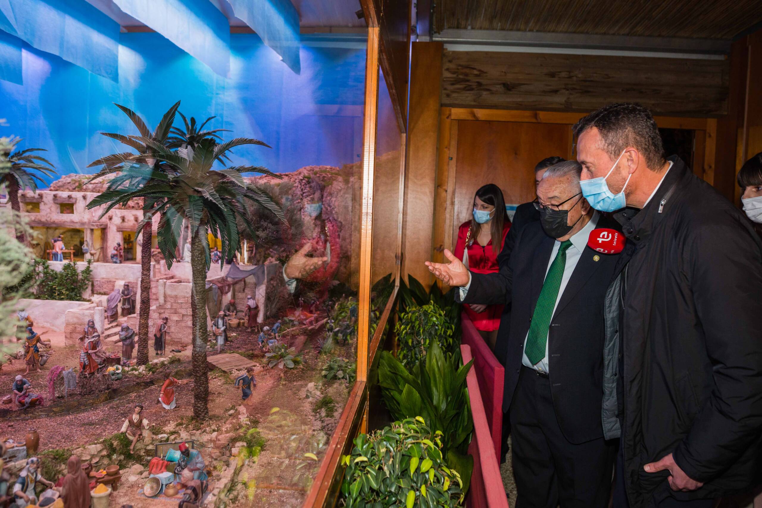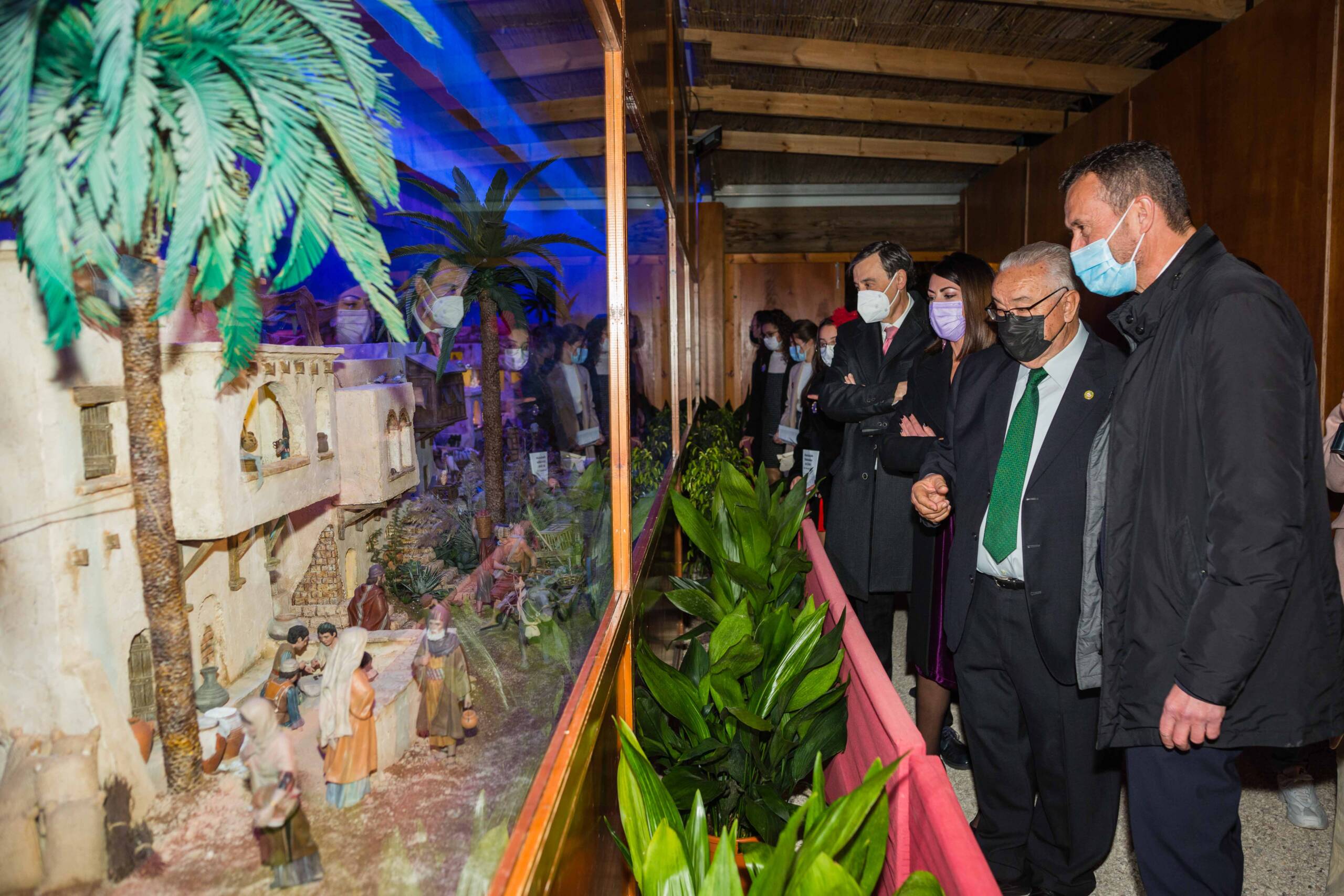 El alcalde, Carlos González, asiste junto a la concejala de Fiestas, Mariola Galiana; el presidente de la Asociación de Belenistas, José Pérez; y el pregonero de la Navidad 2021, el periodista Manolo Alarcón, a la inauguración del nacimiento