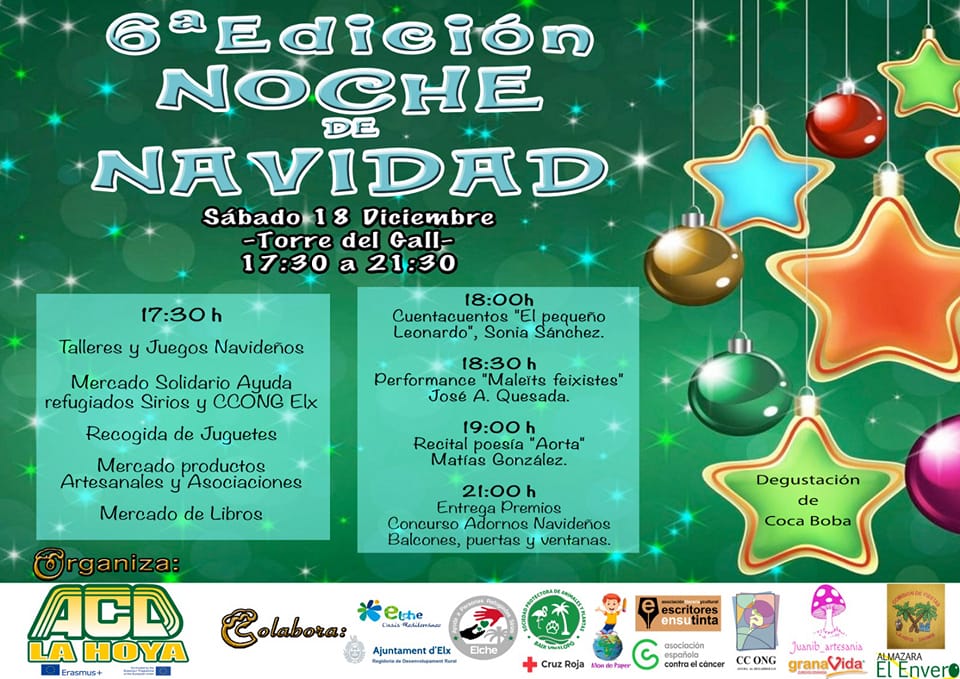 La “Noche de Navidad” cuenta asimismo con la colaboración de diferentes asociaciones, empresas y productores como la Asociación Ayuda a Personas Refugiadas Sirias, Cruz Roja, Sociedad Protectora de Animales y Plantas Baix Vinalopó, Mon de Paper, Escritores en su Tinta, Asociación Española Contra el Cáncer, CCONG, Juanib Artesanía, GranaVida, Almazara el Envero y Comisión de fiesta La Hoya-Daimes.