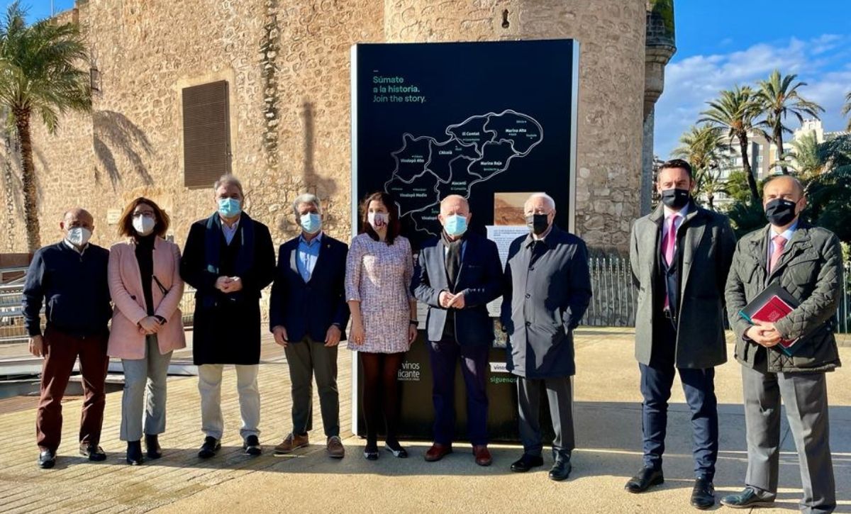 La concejala de Cultura, Marga Antón; el presidente del Consejo Regulador, José Juan Reus; el diputado de Promoción y Desarrollo Local, Sebastián Cañadas; el rector de la Universidad Miguel Hernández de Elche (UMH), Juanjo Ruiz Martínez; y la presidenta de la Ruta del vino, María Miñano, han participado este martes en la inauguración de esta propuesta al aire libre que se prolongará hasta el próximo 22 de marzo y que recorrerá diversos municipios de la provincia con el propósito de aunar historia, enología y arte.