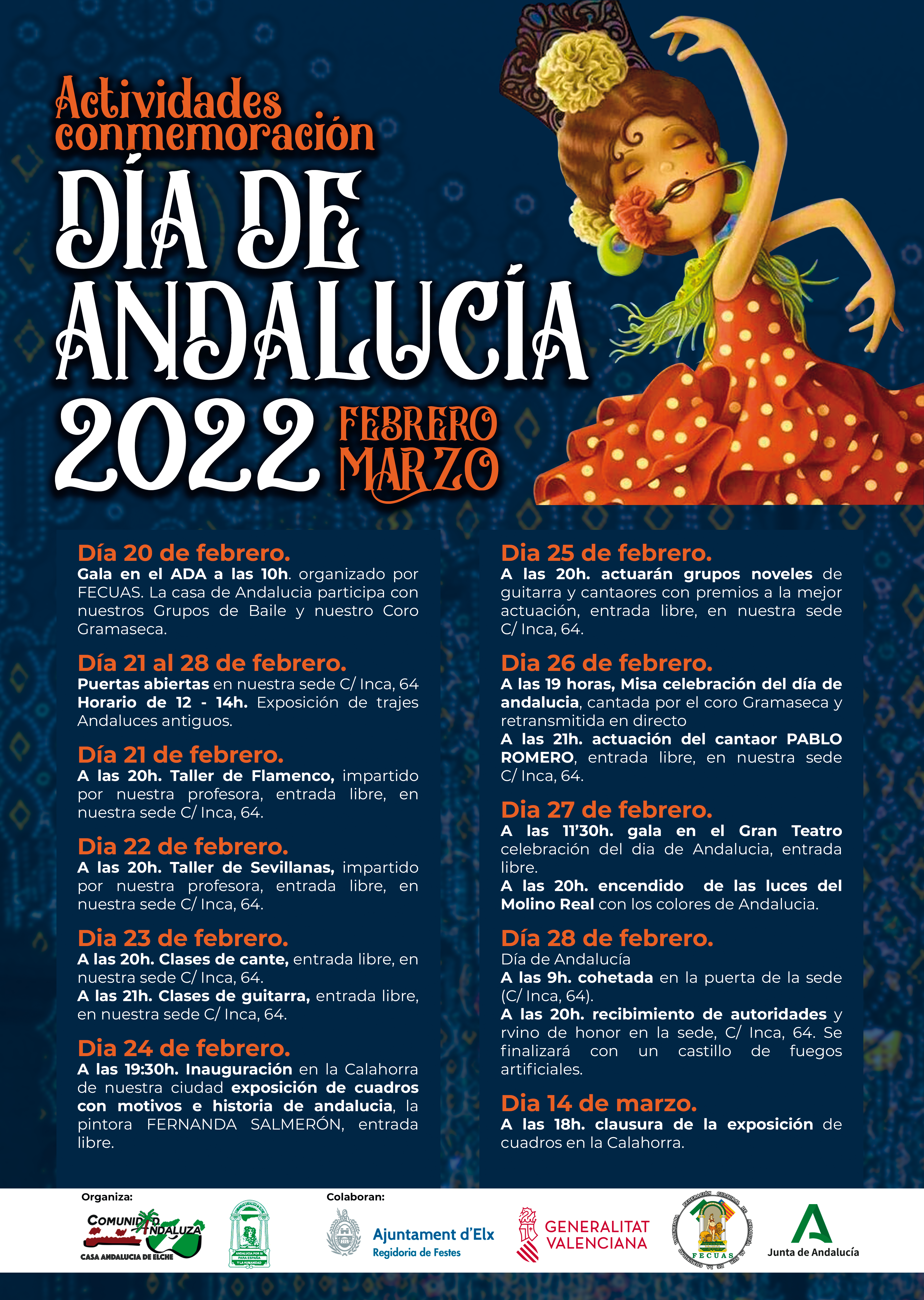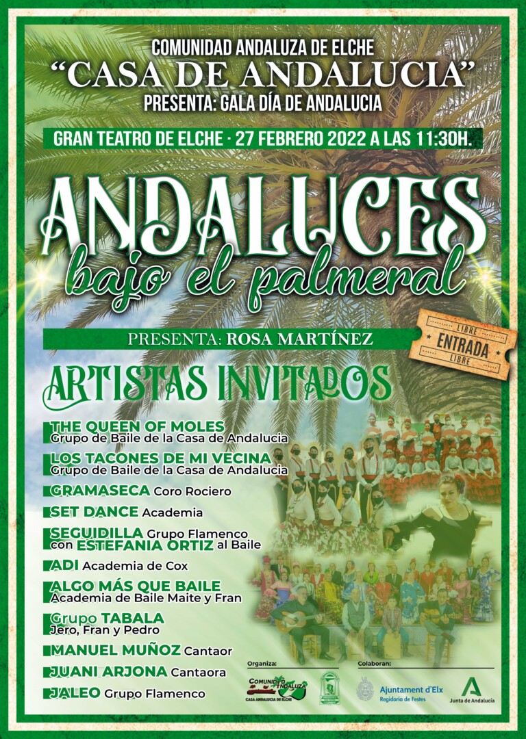 “Tras dos años sin poder celebrar el Día de Andalucía a causa de la pandemia, la Casa de Andalucía de Elche, en colaboración con el Ayuntamiento, recupera los actos para conmemorar este gran día”, ha señalado Mariola Galiana, quien ha añadido que “se trata de una magnífica noticia para la comunidad andaluza en Elche y para todos los ilicitanos e ilicitanas y, como va a ser un año especial, hemos programado una semana de actividades culturales con el fin de acercar a toda la ciudadanía la cultura, las costumbres y el arte andaluz”.