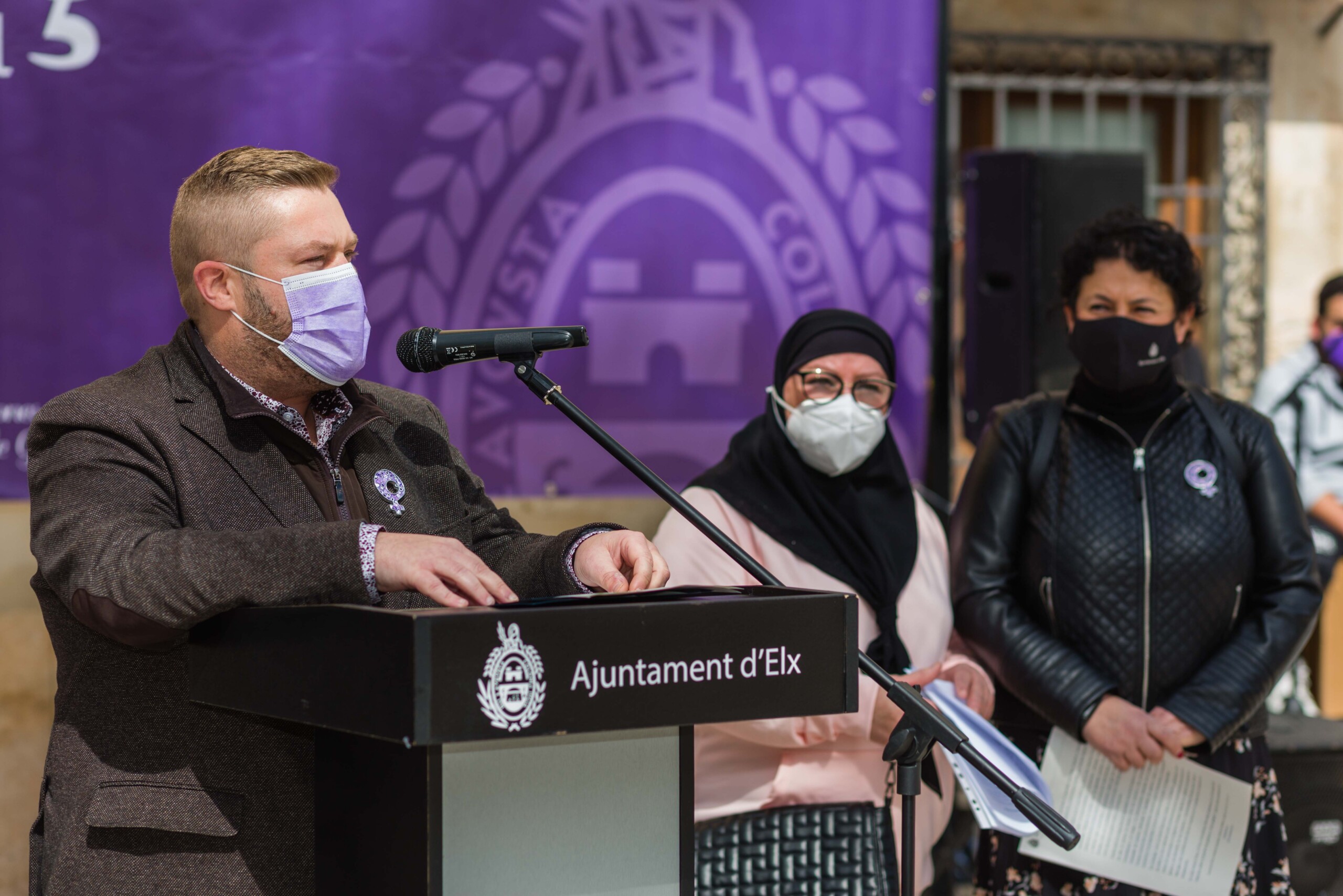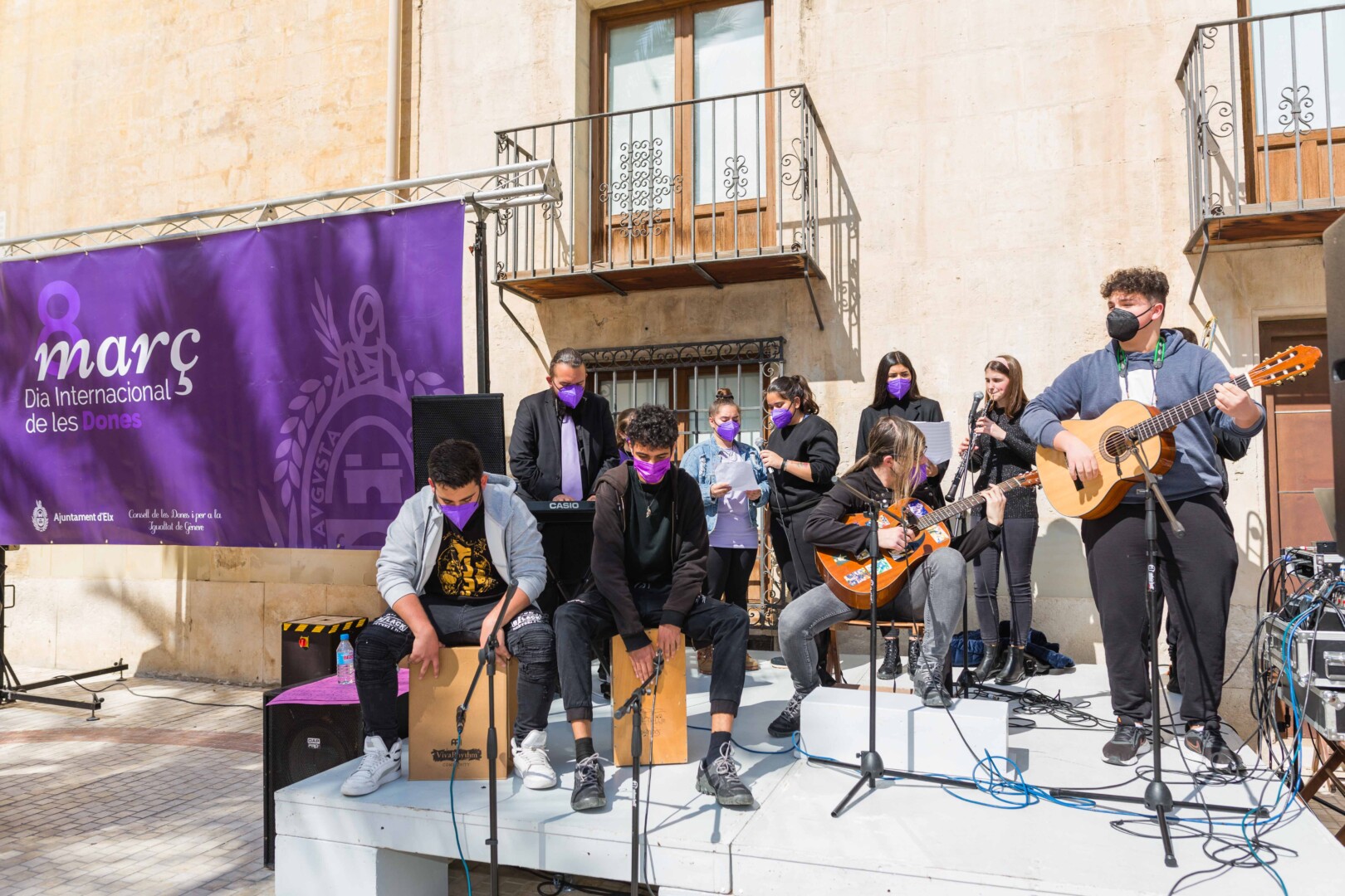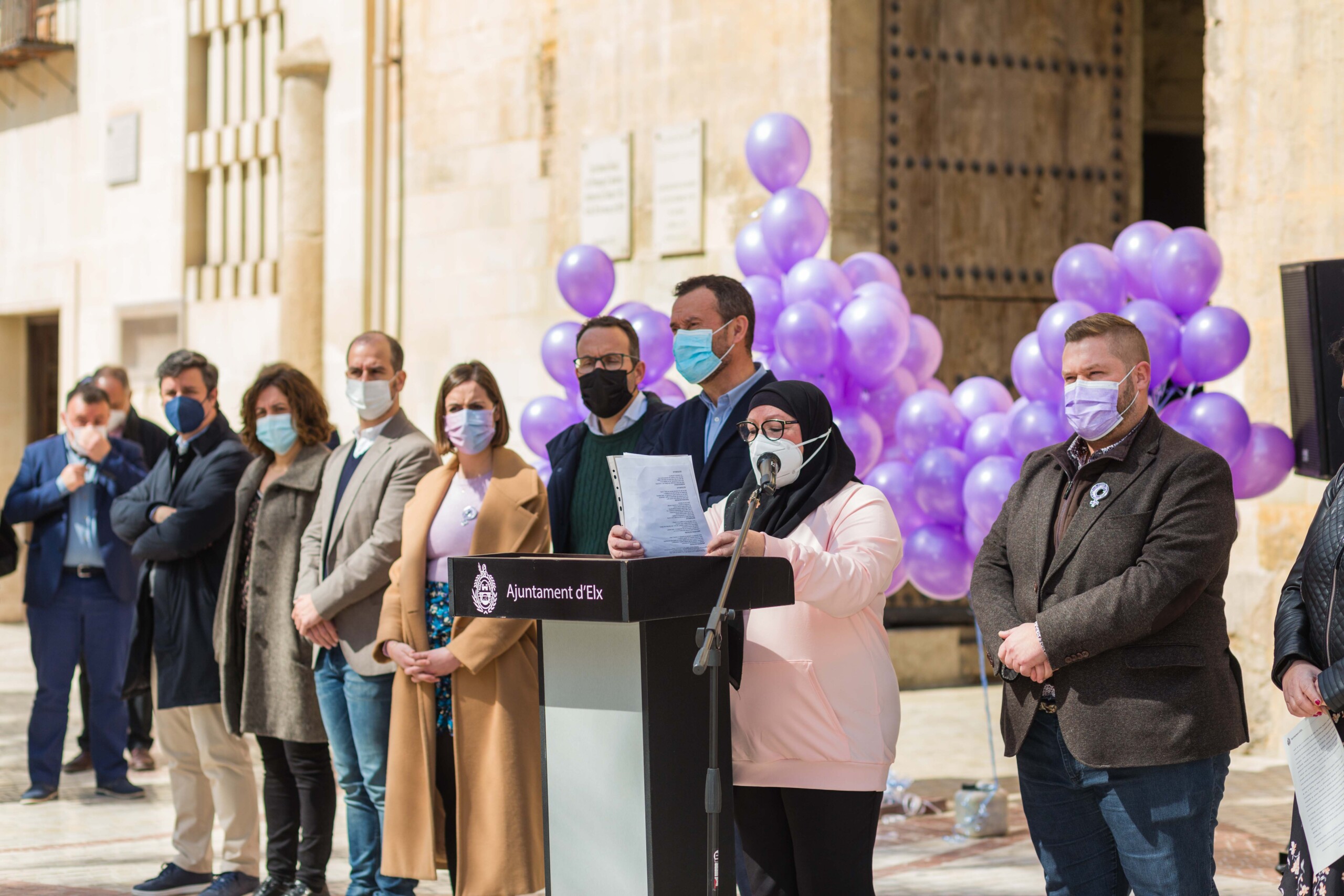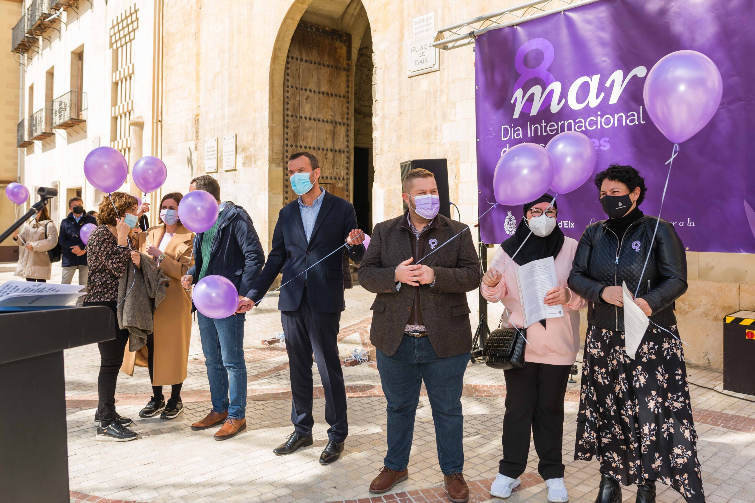 Elche vuelve a teñirse de morado. Tras el parón de la pandemia, el Ayuntamiento ha inaugurado esta mañana los actos conmemorativos del Día Internacional de la Mujer con la lectura del manifiesto institucional de la Federación Valenciana de Municipios y Provincias (FVMP) personalizado para Elche y la interpretación por estudiantes del IES Montserrat Roig de la canción ‘Hay algo en mí’, un homenaje por la lucha de todas las mujeres a lo largo de historia. El encuentro ha tenido lugar en la Plaça de Baix con la presencia de más de un centenar de personas y en él ha participado el alcalde de Elche, Carlos González, el concejal de Igualdad, Mariano Valera y miembros del Equipo de Gobierno, así como de la Corporación Municipal.
