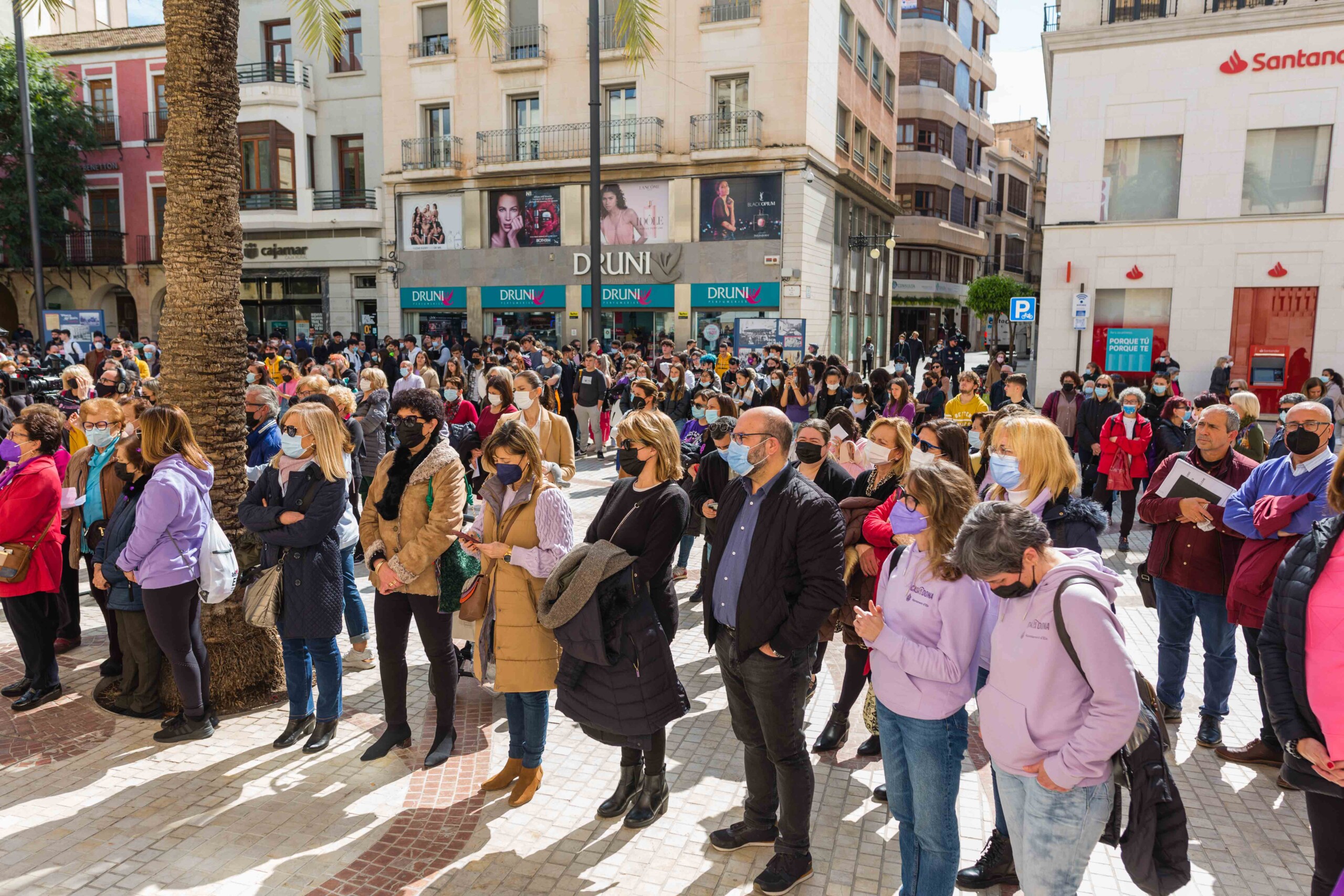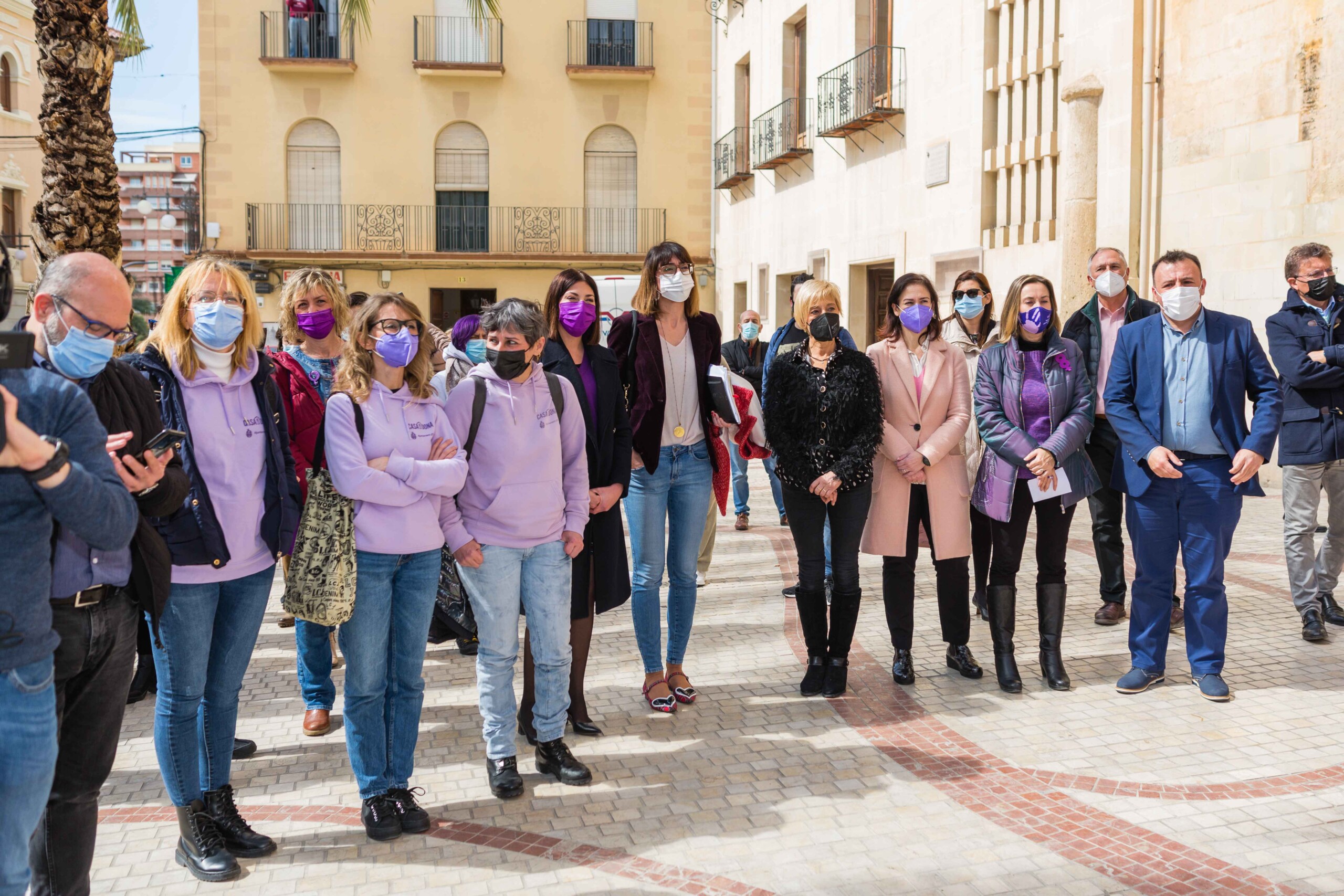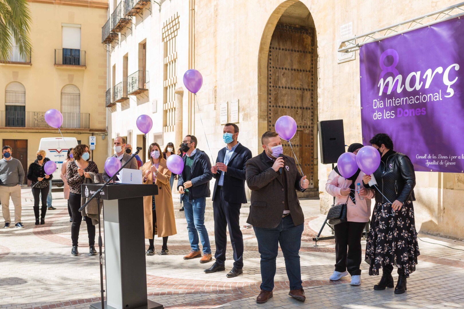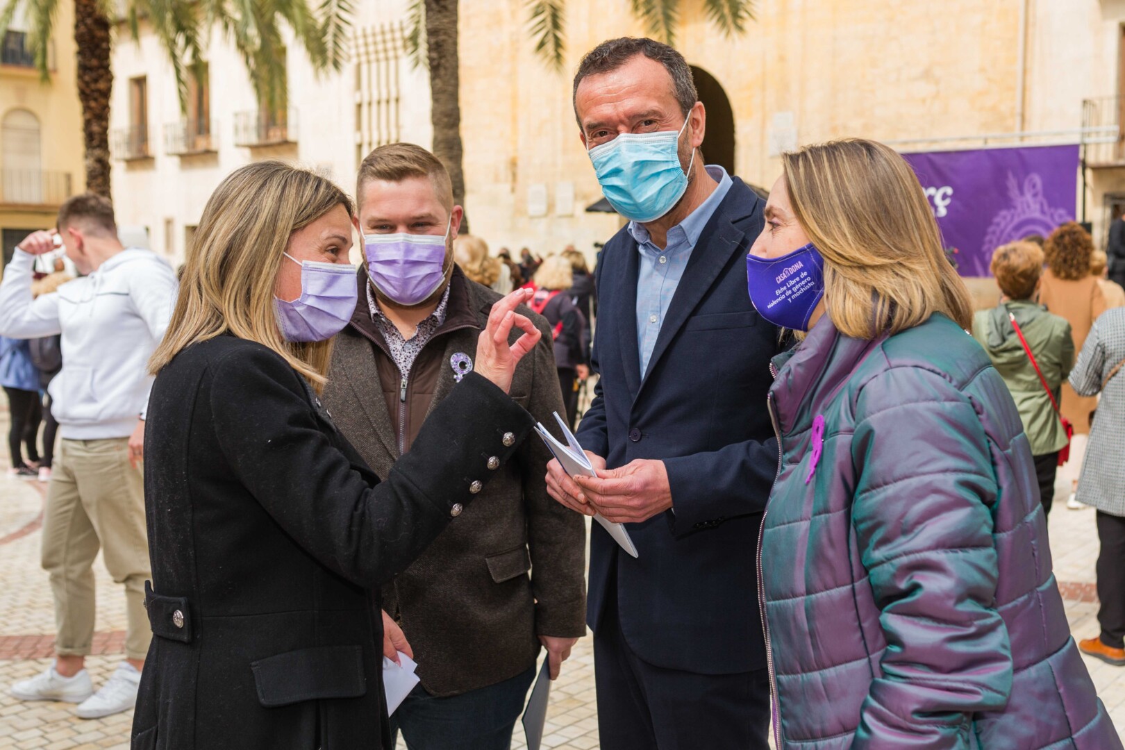 Elche vuelve a teñirse de morado. Tras el parón de la pandemia, el Ayuntamiento ha inaugurado esta mañana los actos conmemorativos del Día Internacional de la Mujer con la lectura del manifiesto institucional de la Federación Valenciana de Municipios y Provincias (FVMP) personalizado para Elche y la interpretación por estudiantes del IES Montserrat Roig de la canción ‘Hay algo en mí’, un homenaje por la lucha de todas las mujeres a lo largo de historia. El encuentro ha tenido lugar en la Plaça de Baix con la presencia de más de un centenar de personas y en él ha participado el alcalde de Elche, Carlos González, el concejal de Igualdad, Mariano Valera y miembros del Equipo de Gobierno, así como de la Corporación Municipal.
